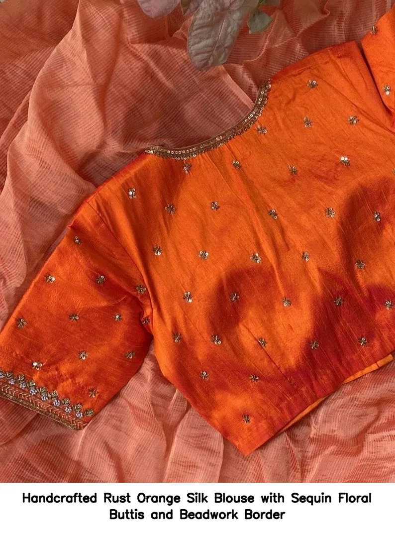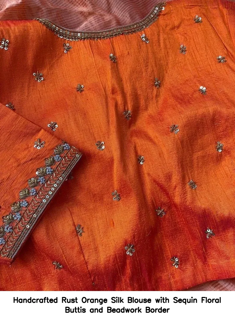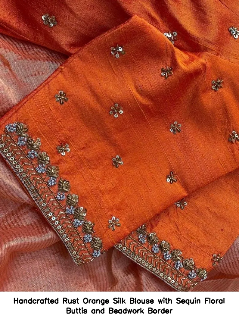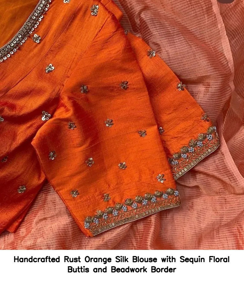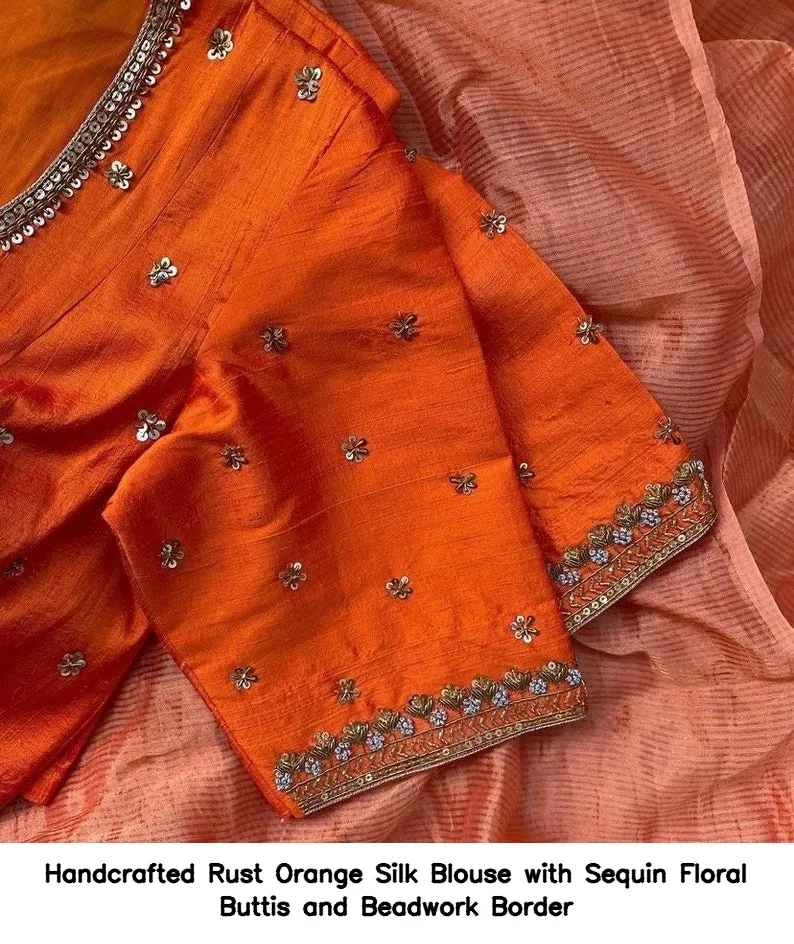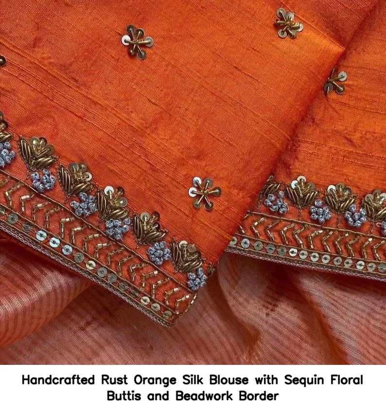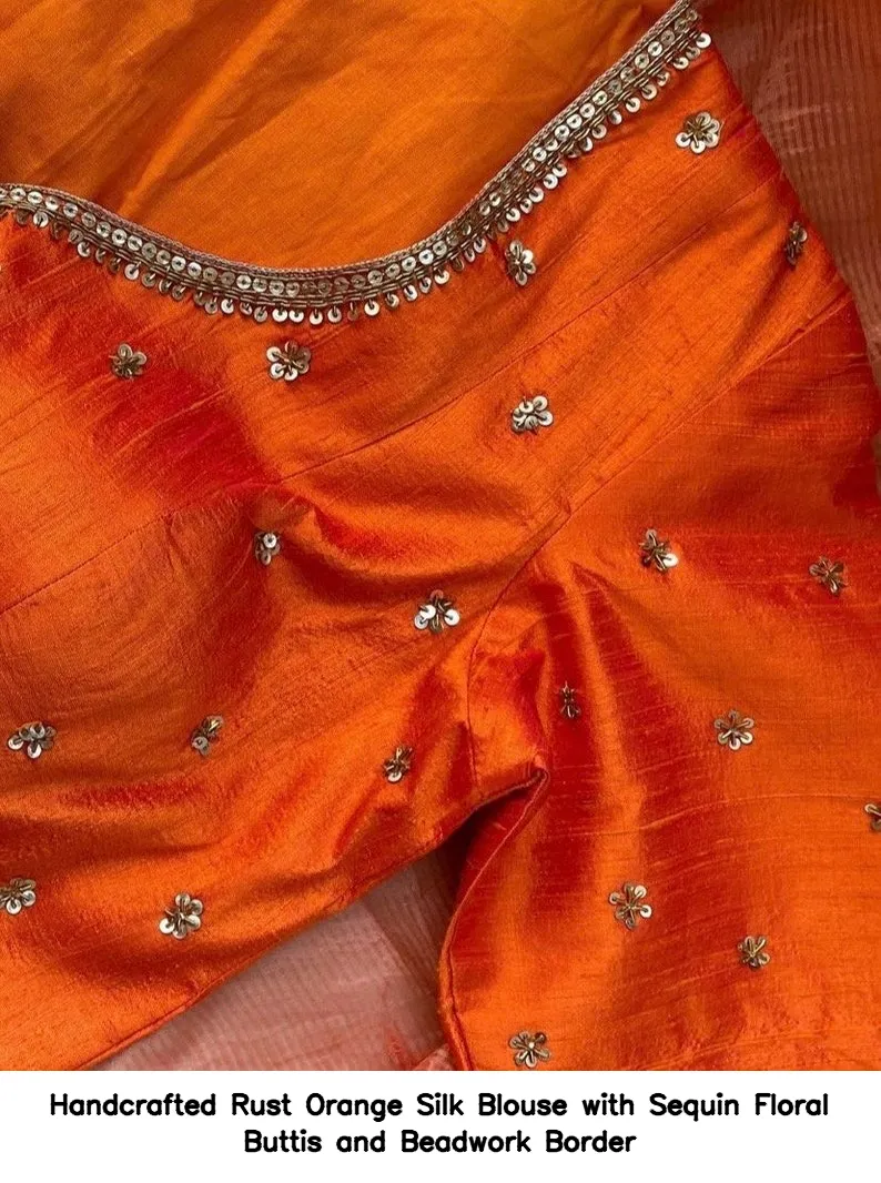 Handcrafted Rust Orange Silk Blouse with Sequin Floral Buttis and Beadwork Border