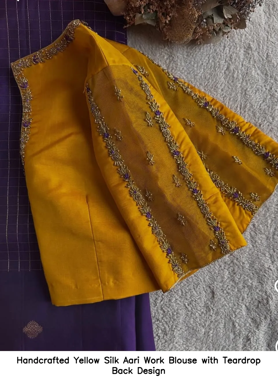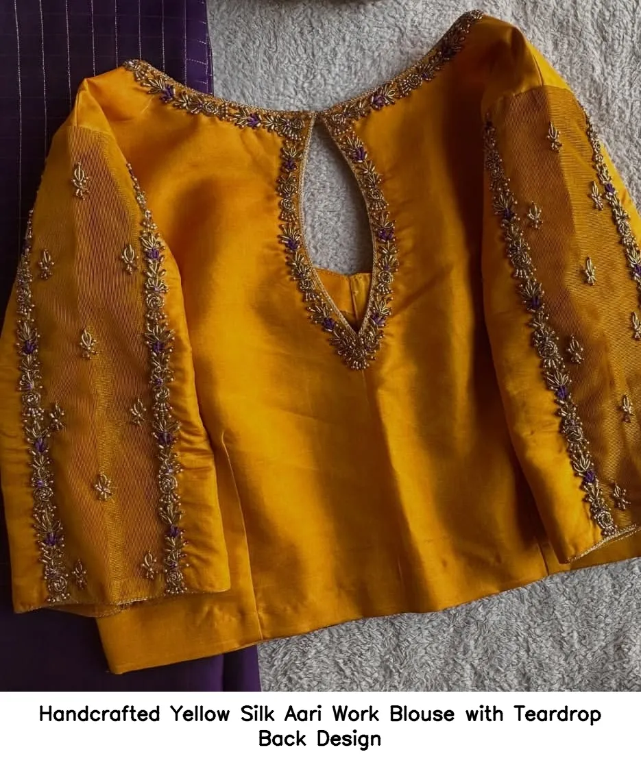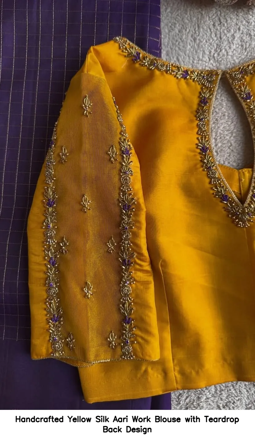 Handcrafted Yellow Silk Aari Work Blouse with Teardrop Back Design