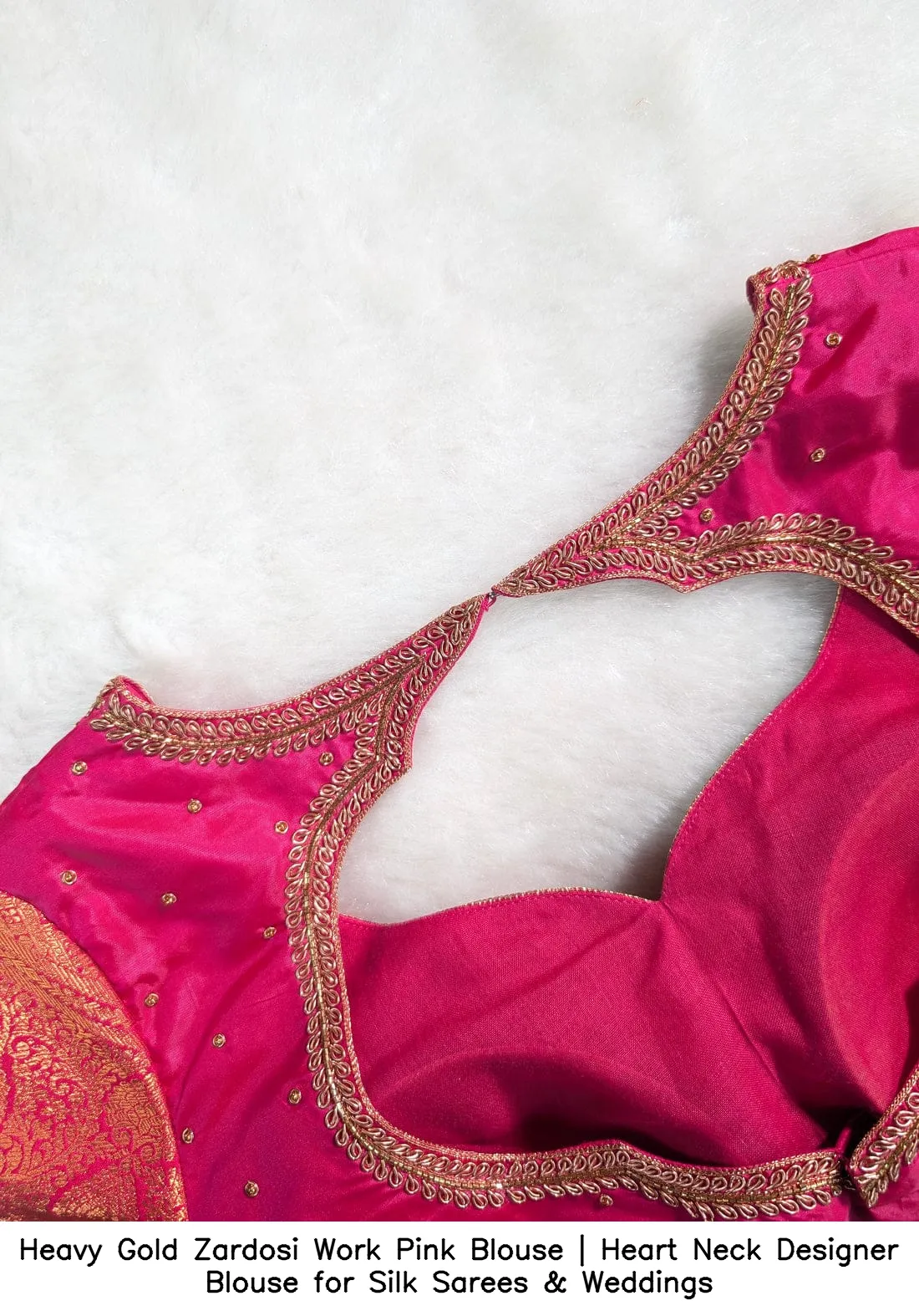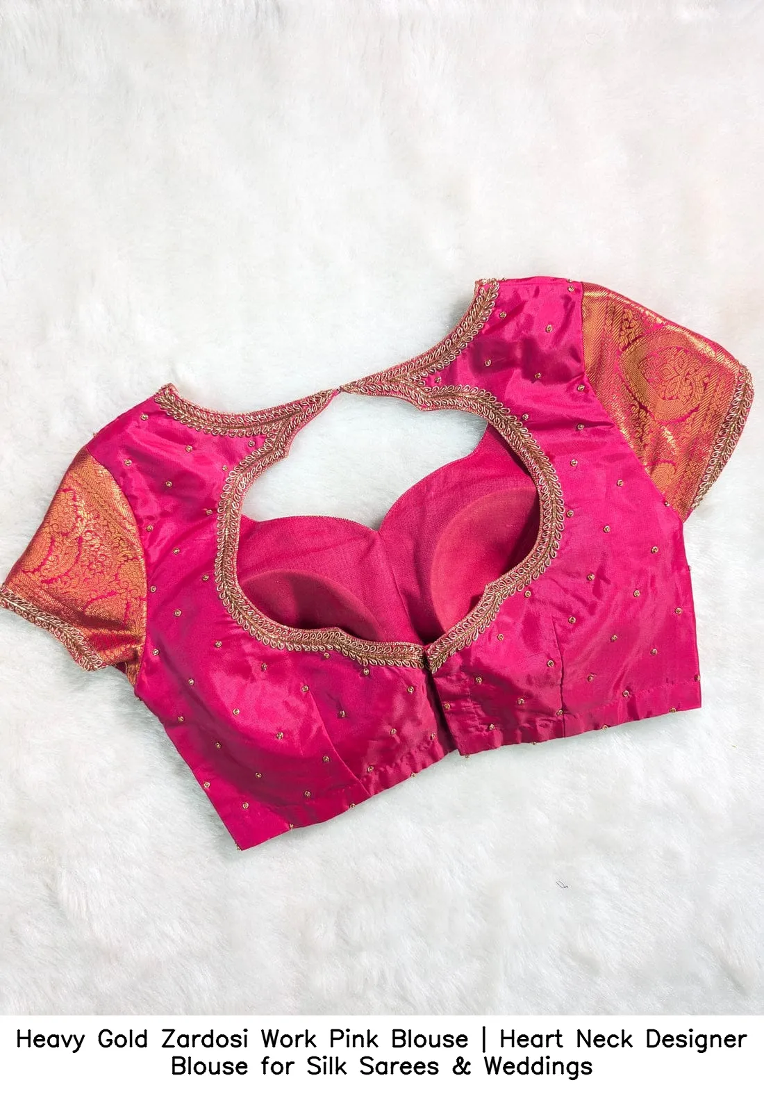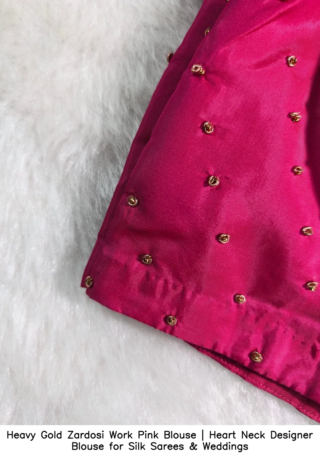 ​​​​​​Heavy Gold Zardosi Work Pink Blouse | Heart Neck Designer Blouse for Silk Sarees & Weddings