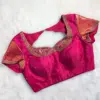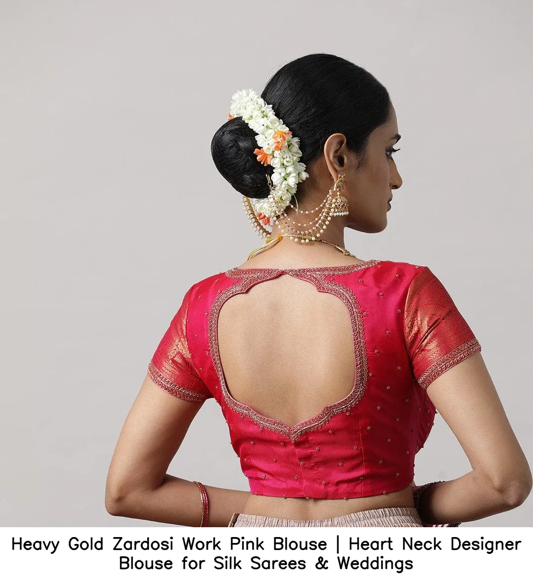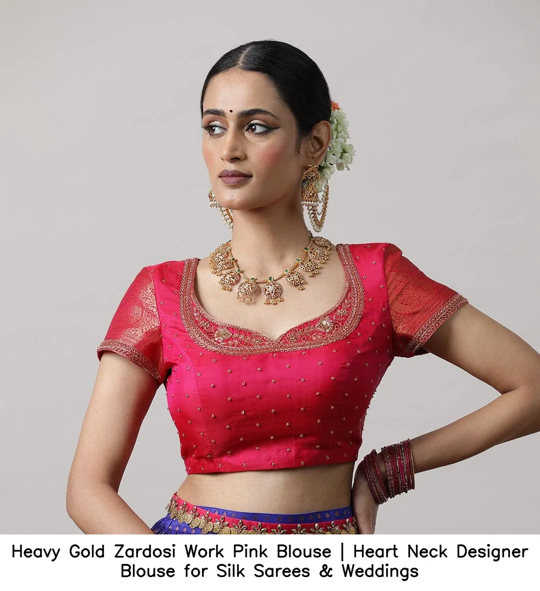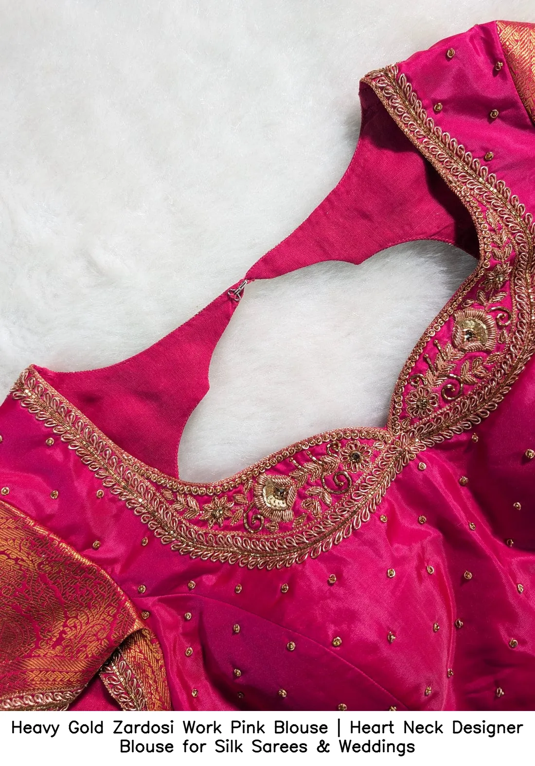 ​​​​​​Heavy Gold Zardosi Work Pink Blouse | Heart Neck Designer Blouse for Silk Sarees & Weddings