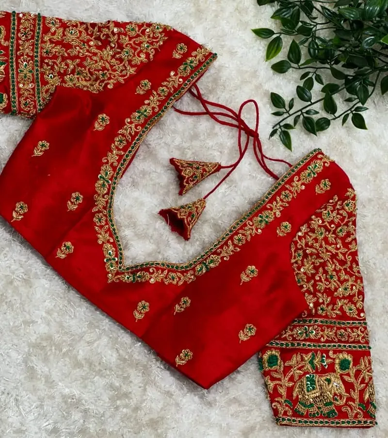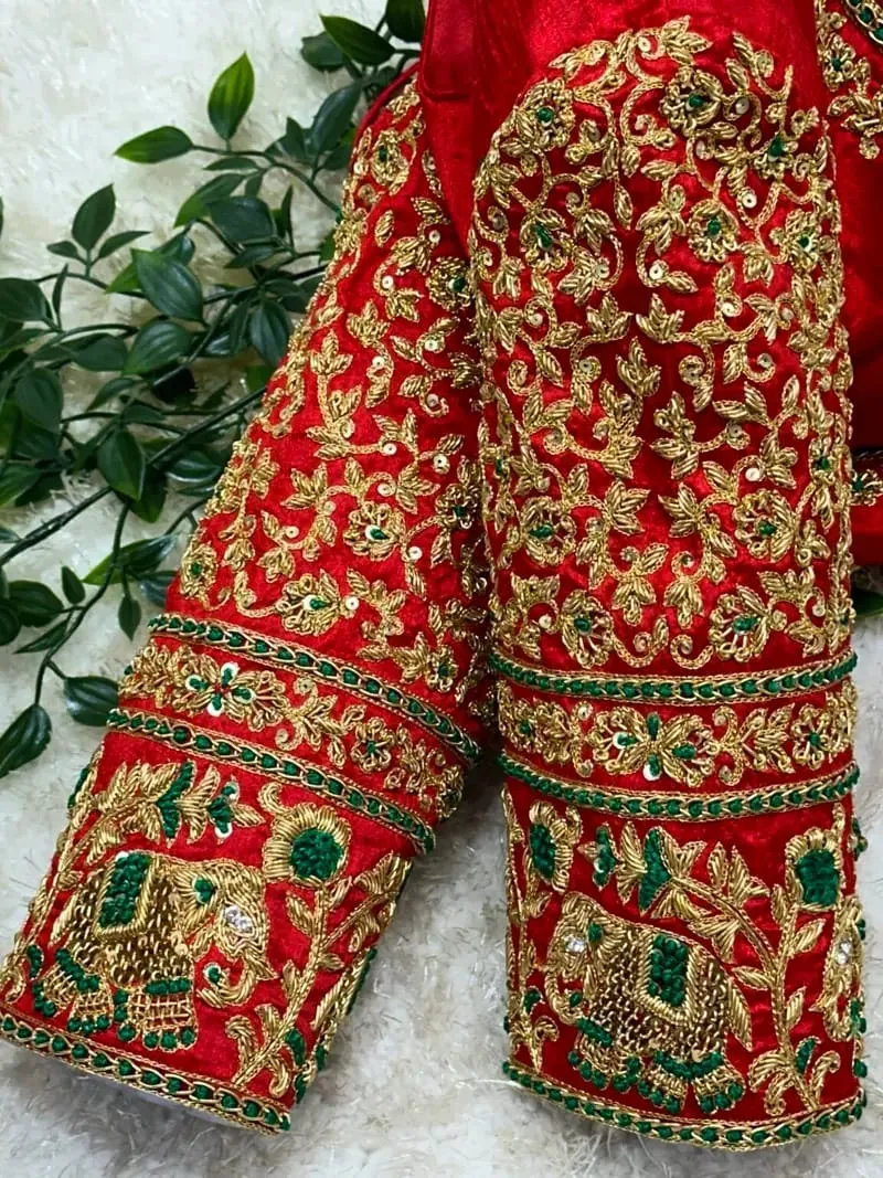 Product Name: Heavy Red Zardosi Maggam Work Bridal Blouse Elephant Embroidery for Weddings