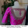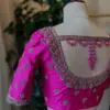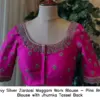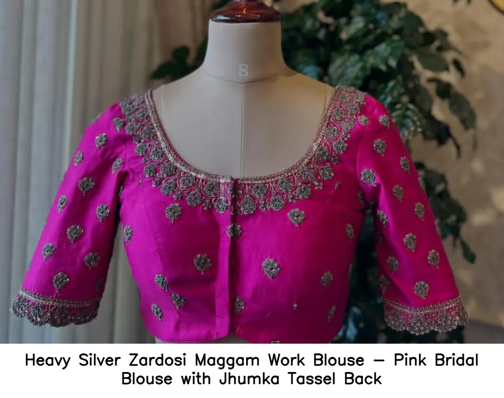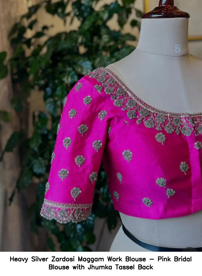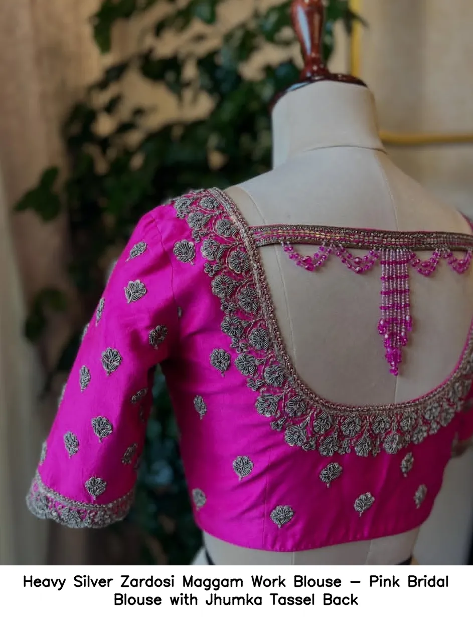The Heavy Silver Zardosi Maggam Work Blouse – Pink Bridal Blouse with Jhumka Tassel Back is made from high-quality half pattu fabric. Priced at 5000 INR, it comes in various sizes, including XL, XXL, and 3XL. The blouse is available in gorgeous colors: Red, Pink, Blue, Purple, and Wine.