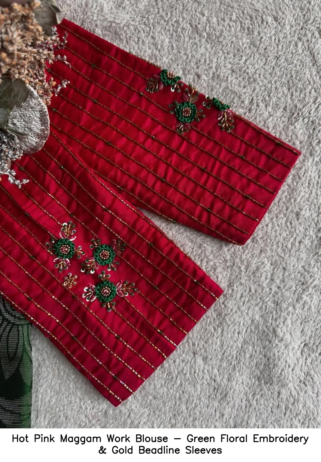 Hot Pink Maggam Work Blouse – Green Floral Embroidery & Gold Beadline Sleeves