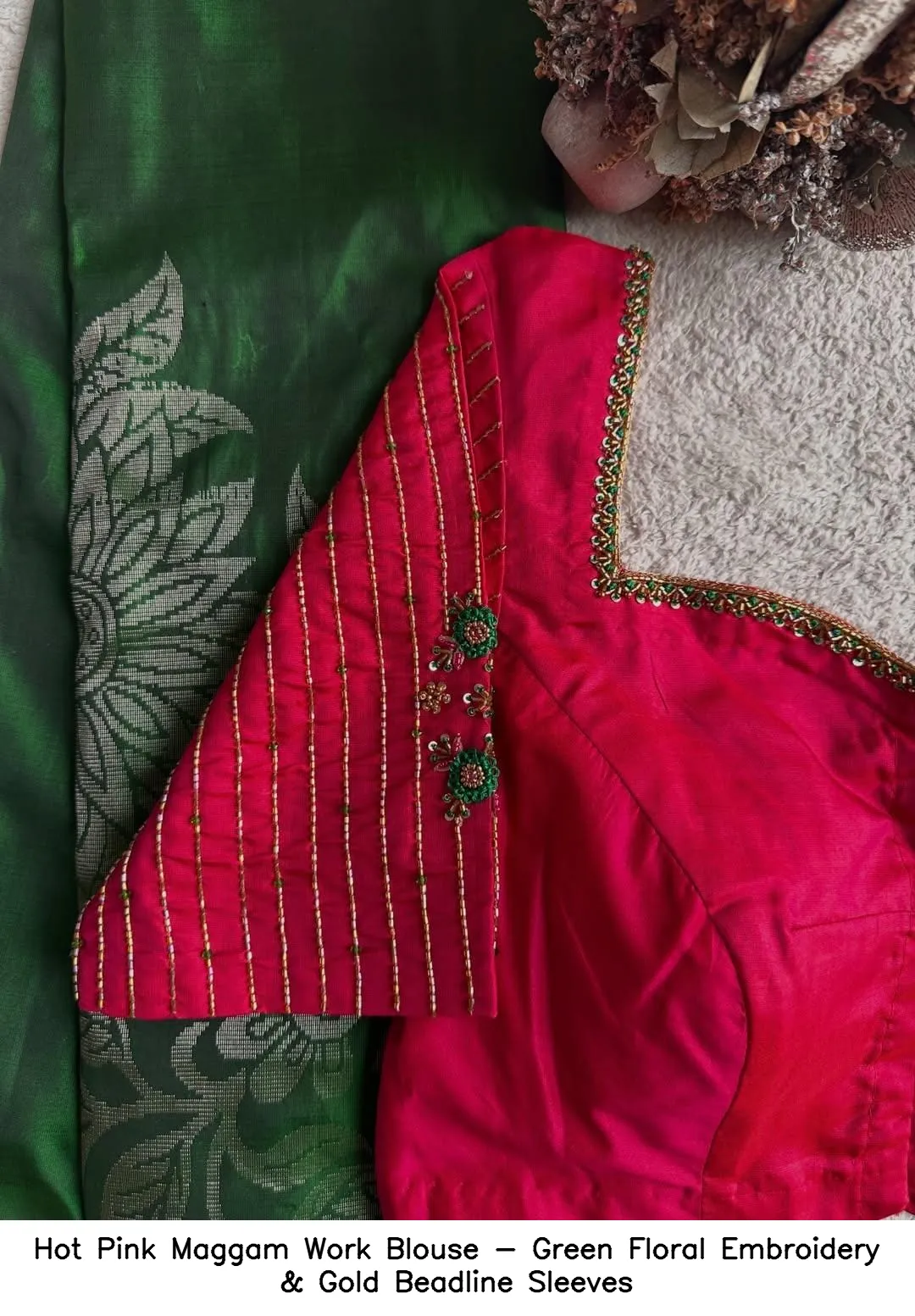 Product Name: Hot Pink Maggam Work Blouse – Green Floral Embroidery & Gold Beadline Sleeves