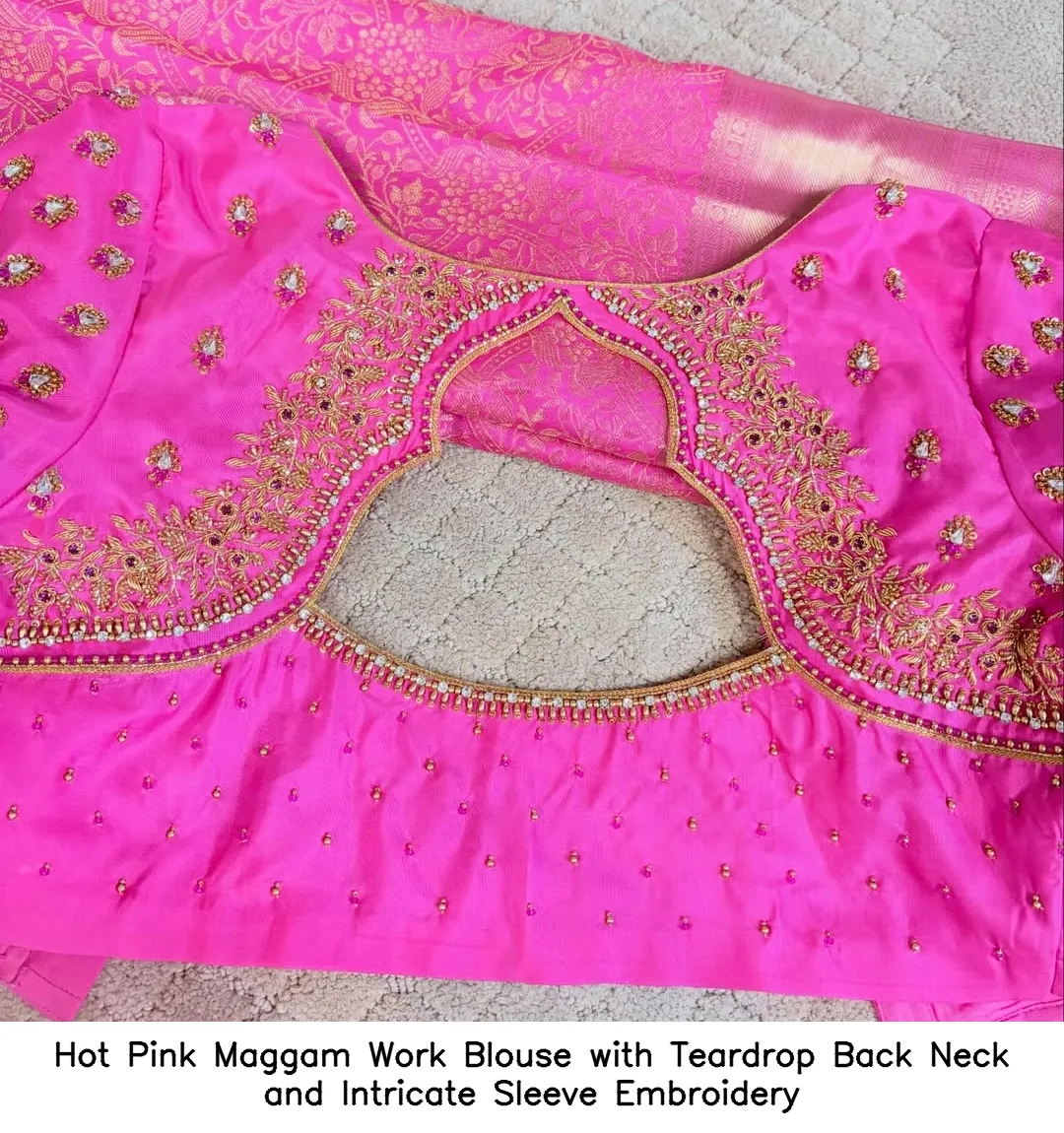 Introducing the stunning Hot Pink Maggam Work Blouse with Teardrop Back Neck and Intricate Sleeve Embroidery. This exquisite blouse is perfect for festive occasions and will elevate your wardrobe. Crafted with attention to detail, it combines traditional craftsmanship with modern design.
