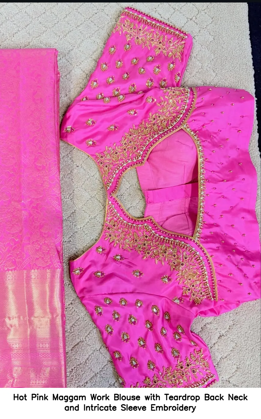 To maintain the beauty of your Hot Pink Maggam Work Blouse with Teardrop Back Neck and Intricate Sleeve Embroidery, we recommend gentle hand washing in cold water. Avoid harsh detergents and hang to dry in a shaded area.