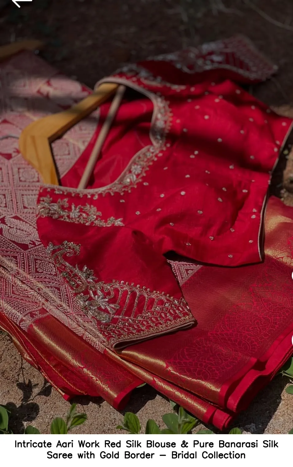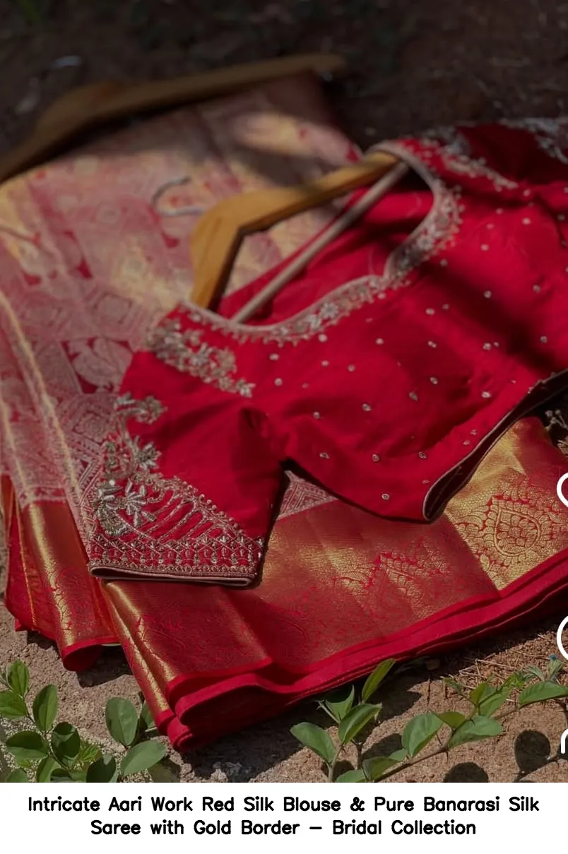- Product Name: Intricate Aari Work Red Silk Blouse & Pure Banarasi Silk Saree with Gold Border – Bridal Collection
