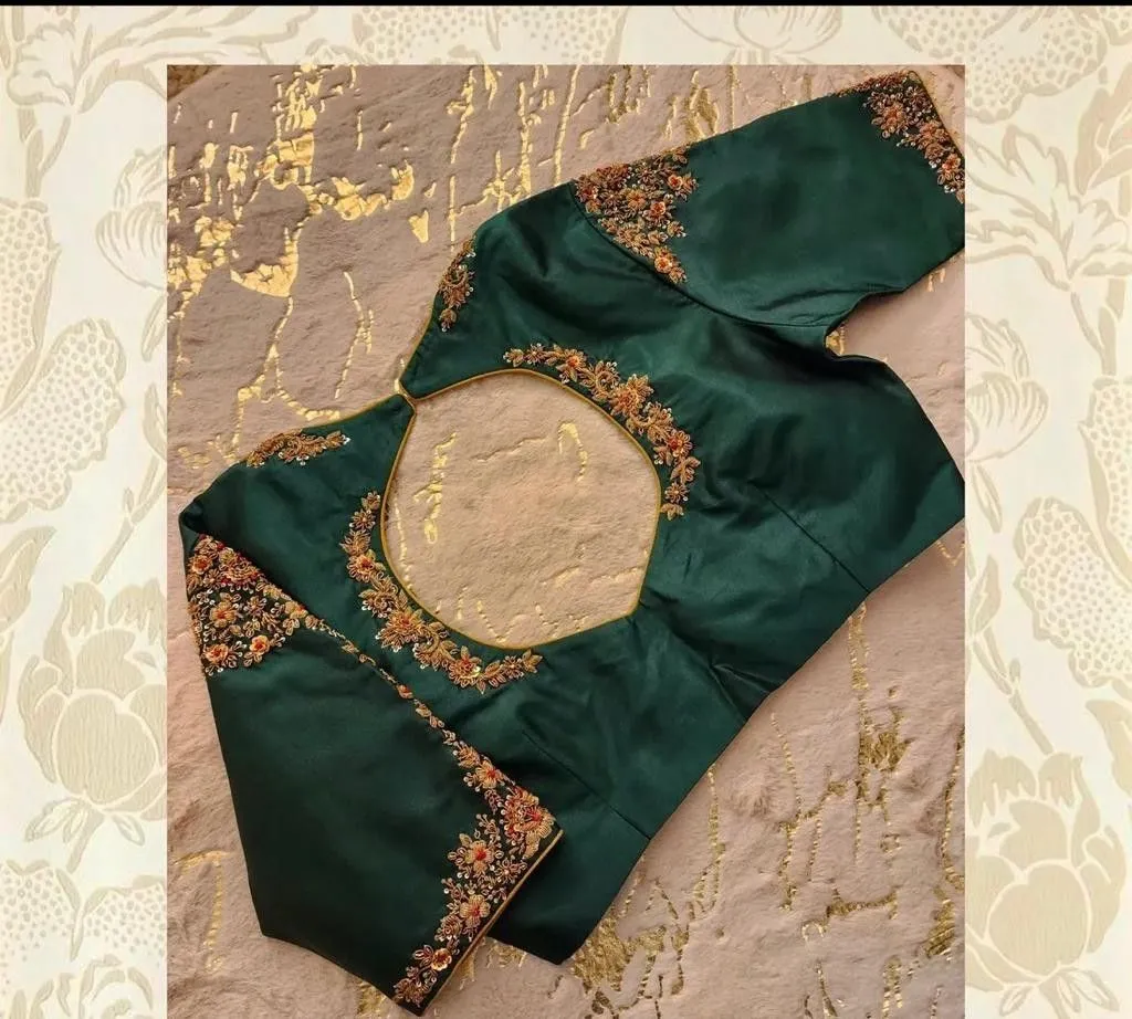 Product Name: Latest Bottle Green Boat Neck Bridal Blouse Premium Aari Maggam Handwork Made to Measure
