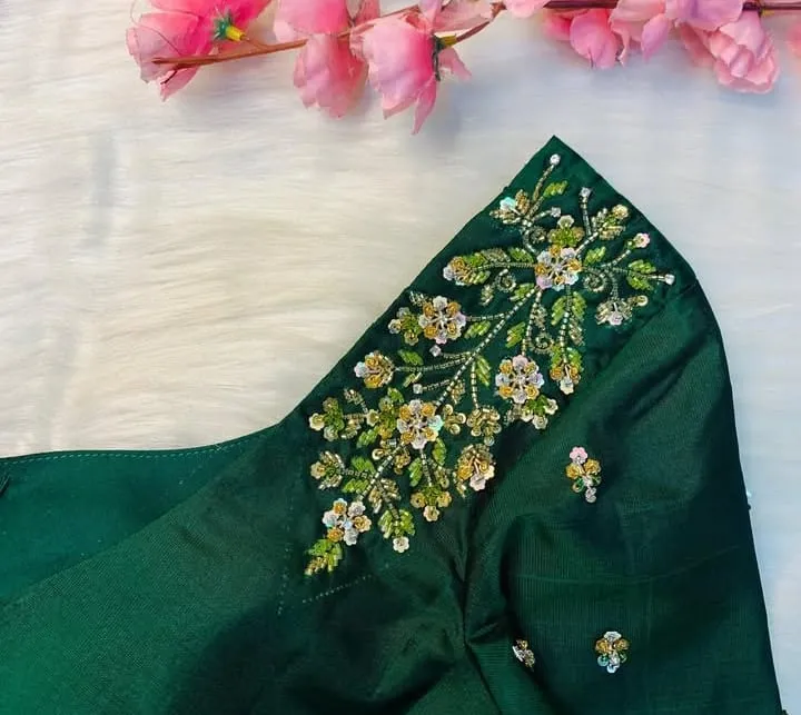 Latest Bottle Green Shoulder Design Blouse Premium Gold Maggam Work at Best Price Features and Benefits