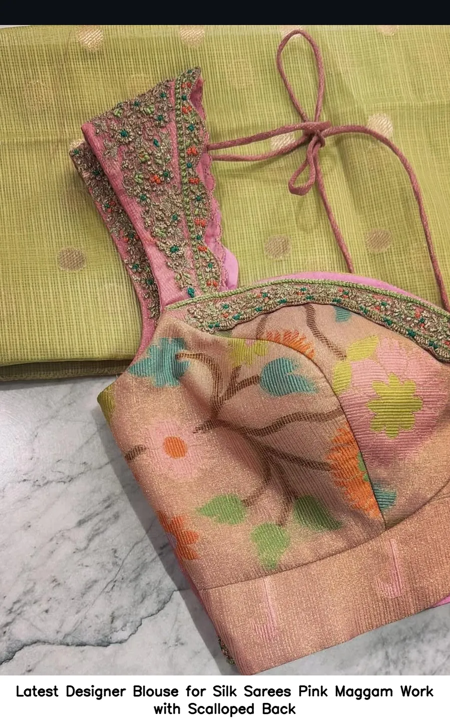 Introducing the latest designer blouse for silk sarees – Pink Maggam work with scalloped back. This stunning piece is crafted with elegance in mind, making it a perfect addition to any traditional wardrobe.