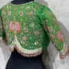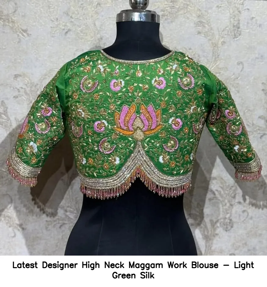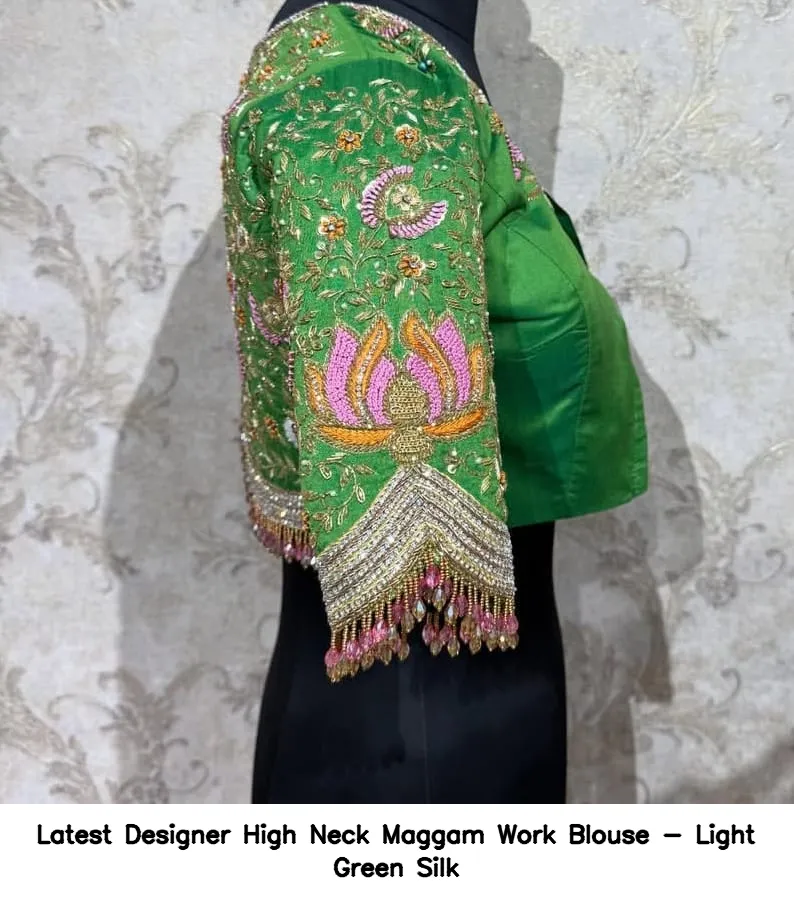 ​Latest Designer High Neck Maggam Work Blouse – Light Green Silk