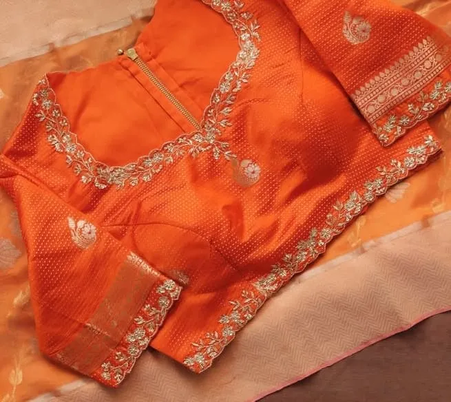 Product Name: Latest Orange High Neck Bridal Maggam Work Blouse Shop Designer Collection
