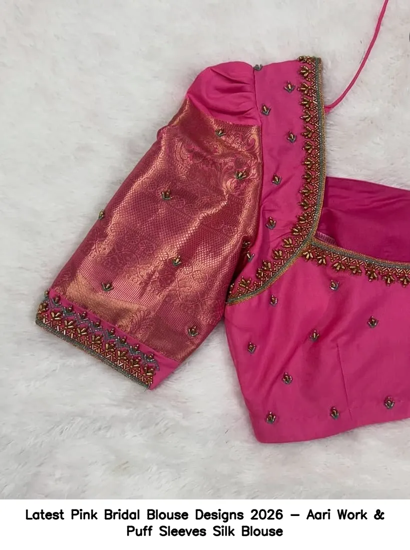 Latest Pink Bridal Blouse Designs 2026 – Aari Work & Puff Sleeves Silk Blouse
