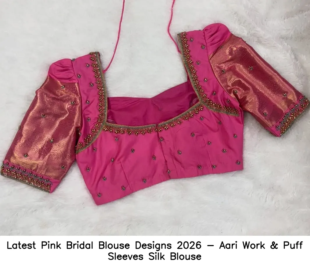 Product Name: Latest Pink Bridal Blouse Designs 2026 – Aari Work & Puff Sleeves Silk Blouse