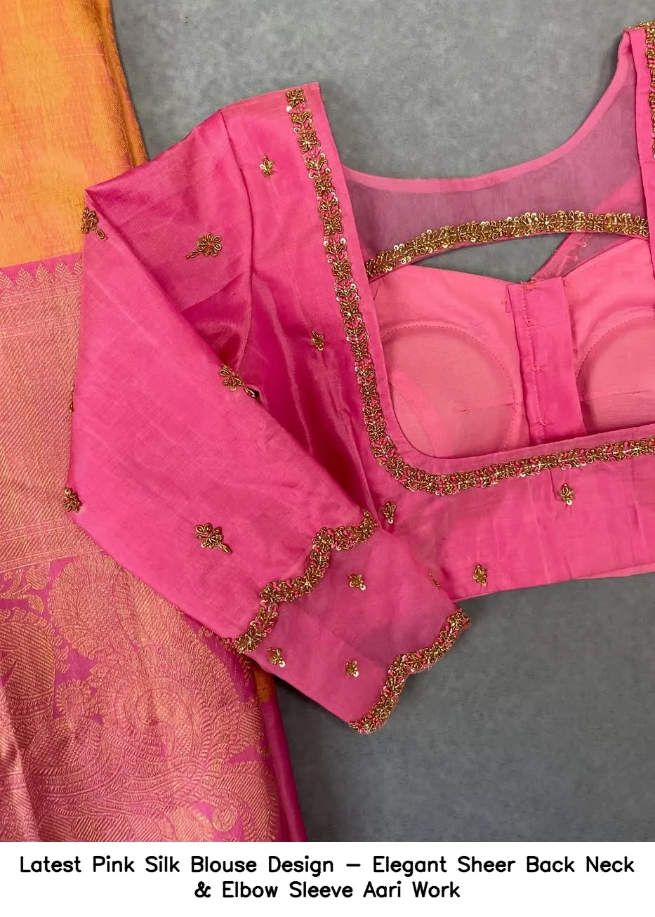 Latest Pink Silk Blouse Design – Elegant Sheer Back Neck & Elbow Sleeve Aari Work