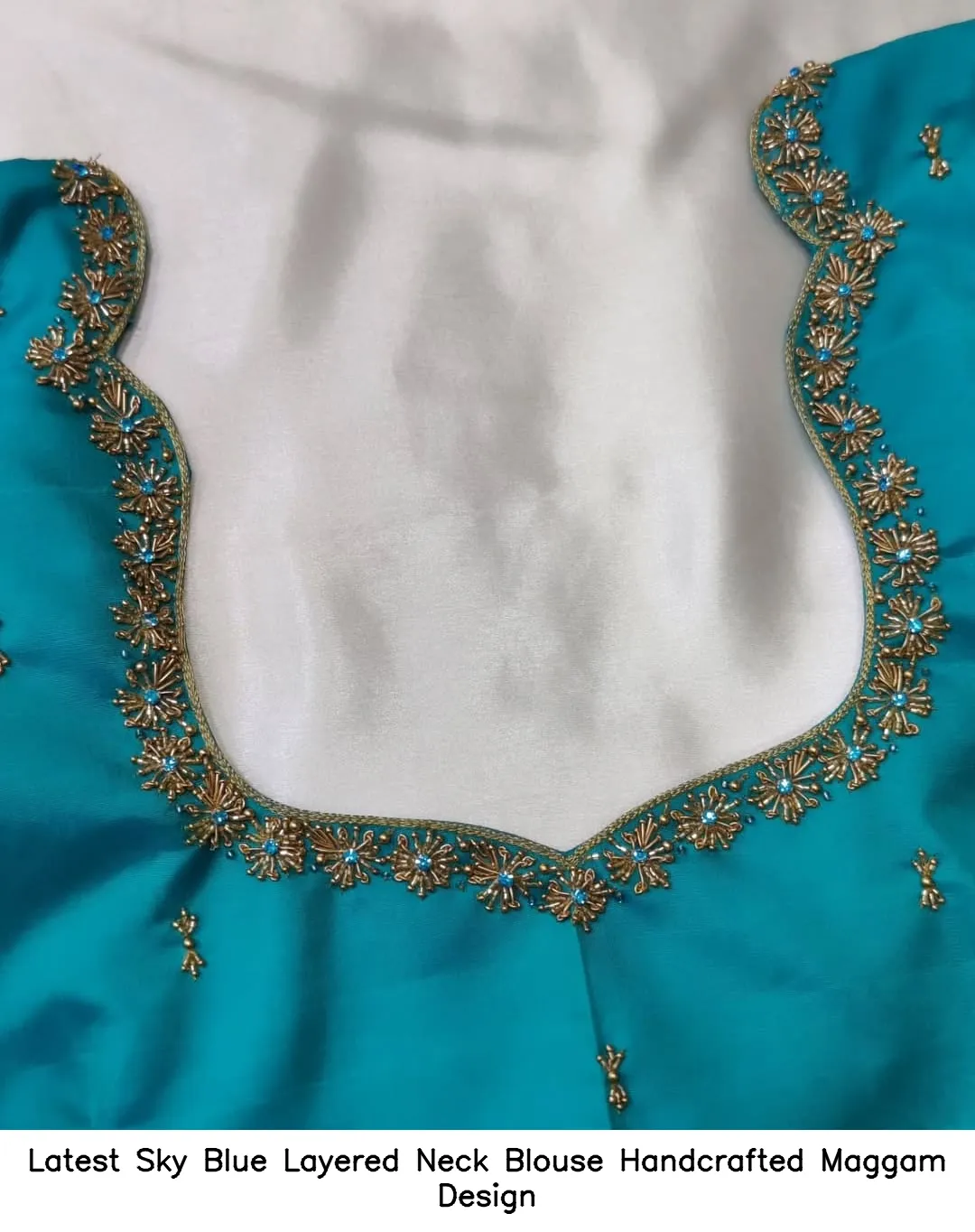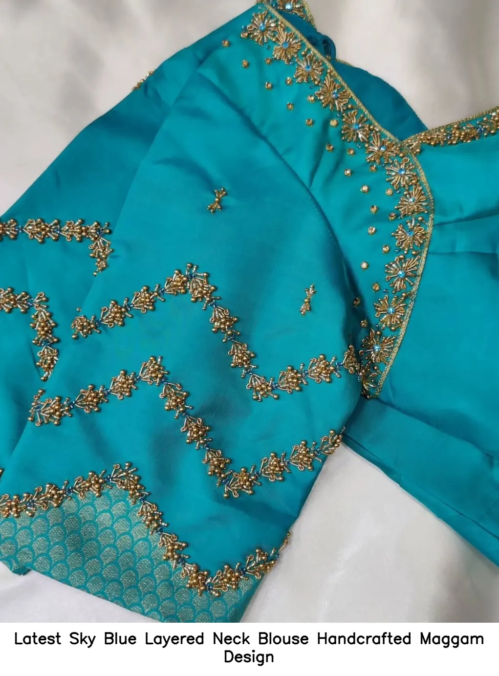 Latest Sky Blue Layered Neck Blouse – Handcrafted Maggam Design