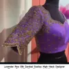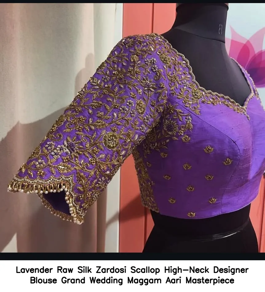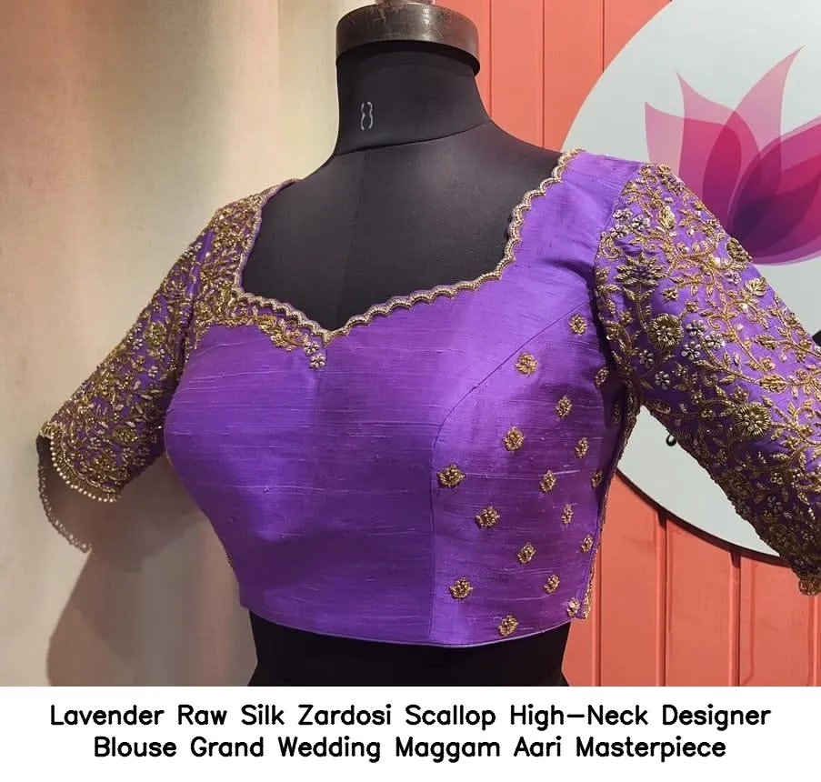 Lavender Raw Silk Zardosi Scallop High-Neck Designer Blouse – Grand Wedding Maggam Aari Masterpiece