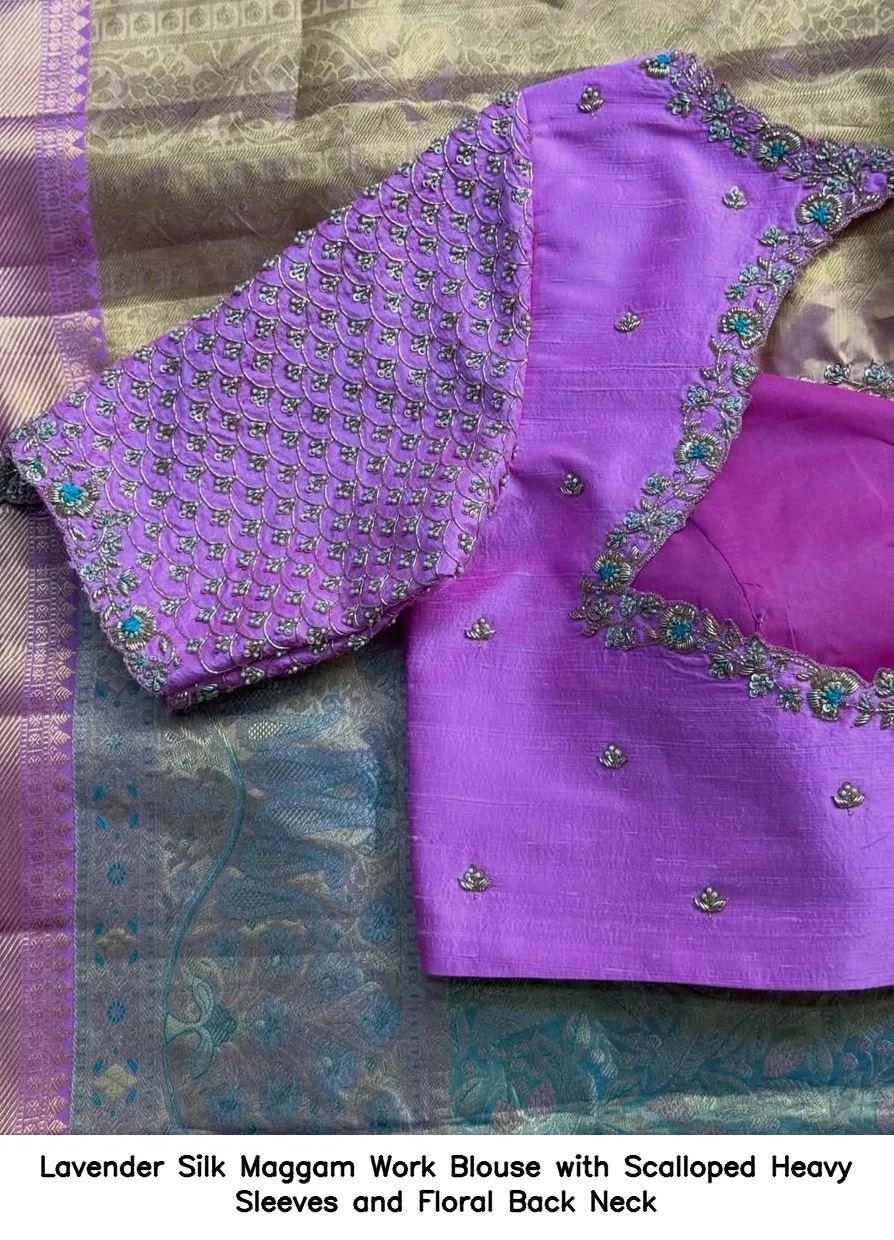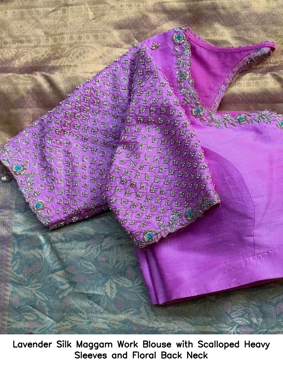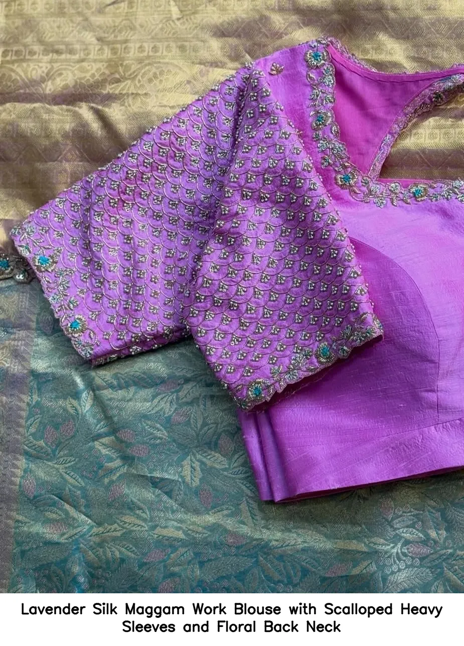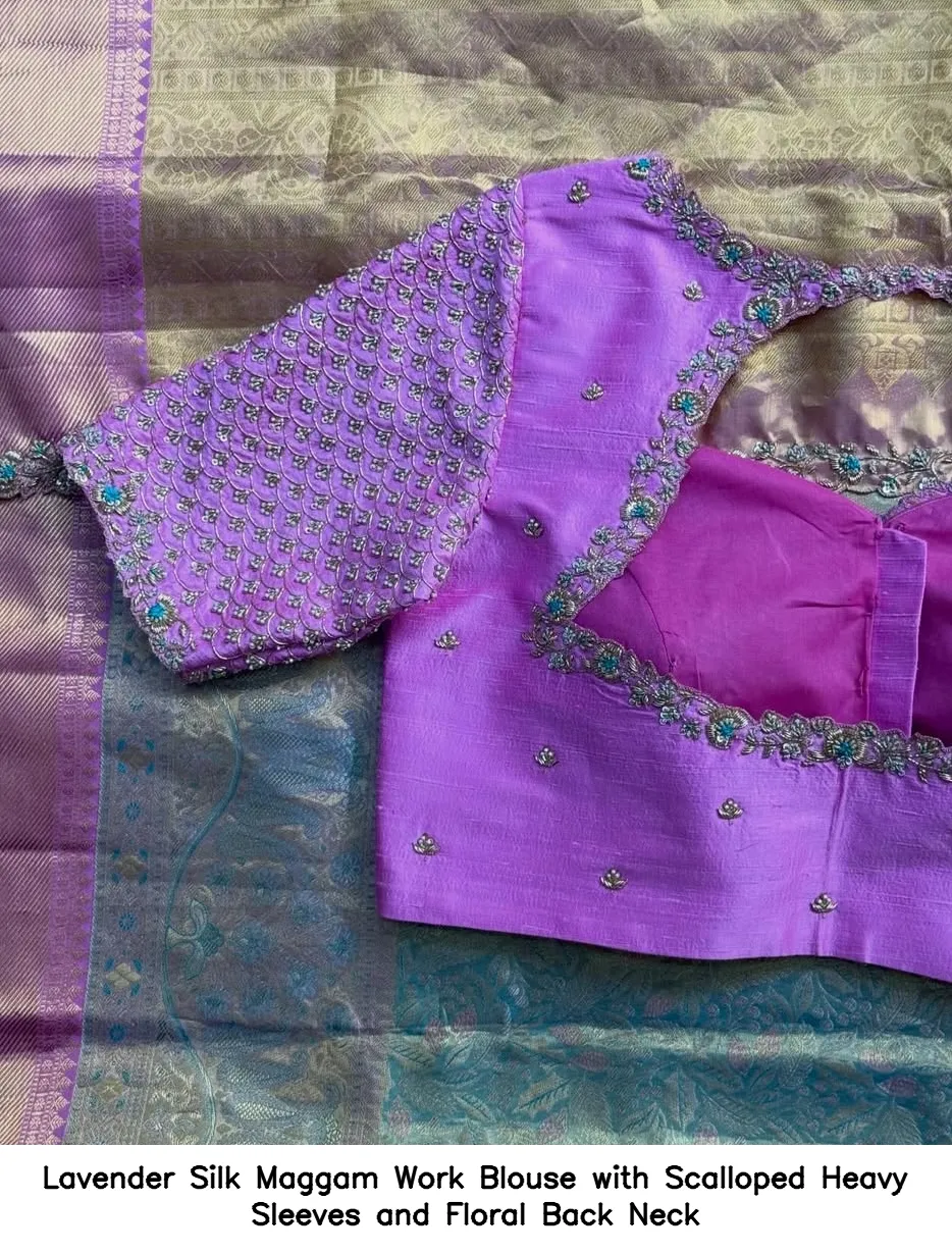 Lavender Silk Maggam Work Blouse with Scalloped Heavy Sleeves and Floral Back Neck
