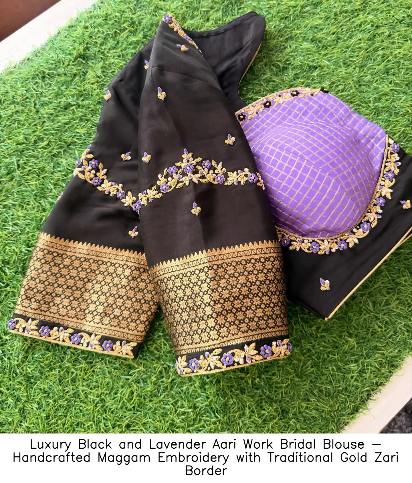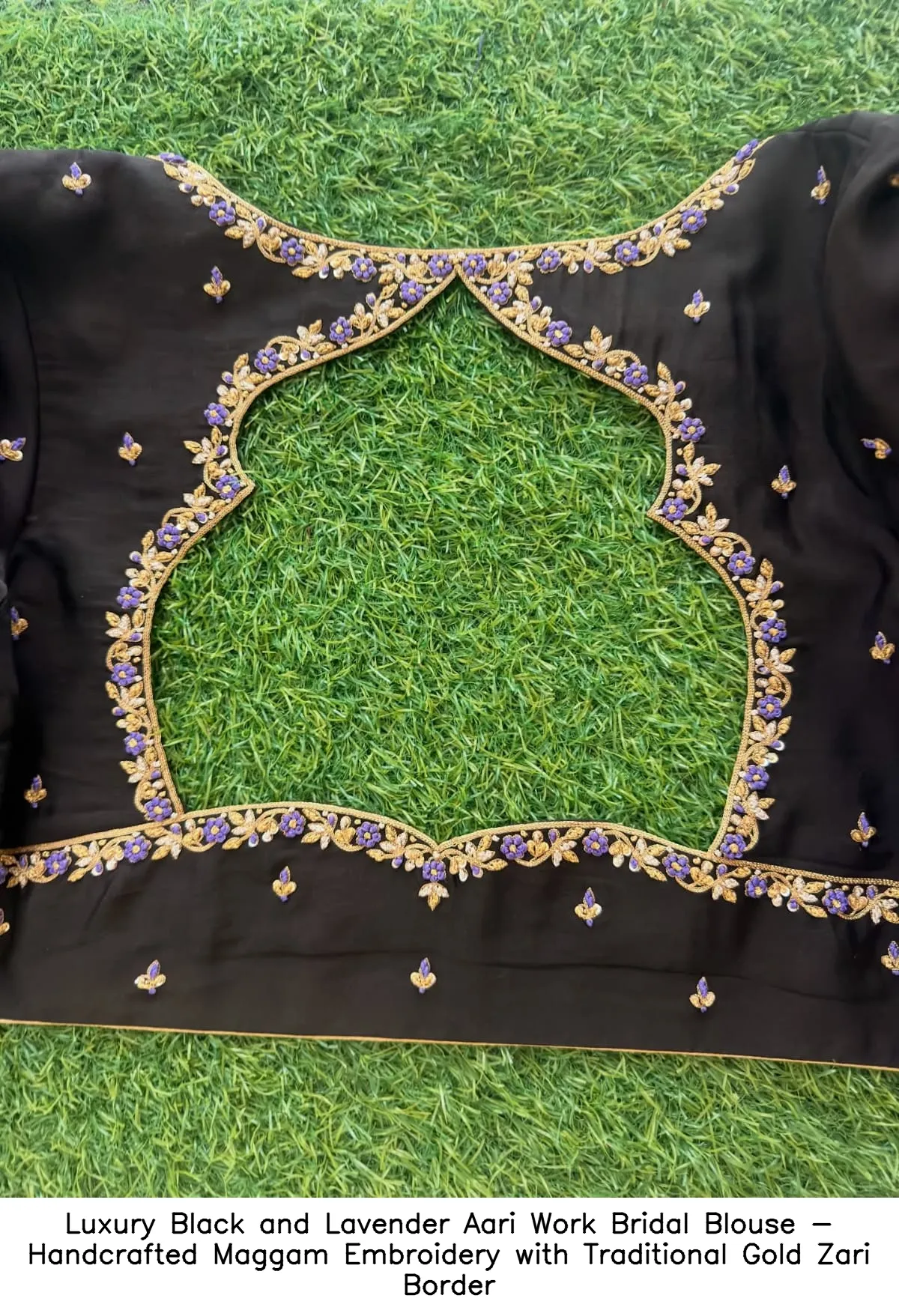 Luxury Black and Lavender Aari Work Bridal Blouse – Handcrafted Maggam Embroidery with Traditional Gold Zari Border