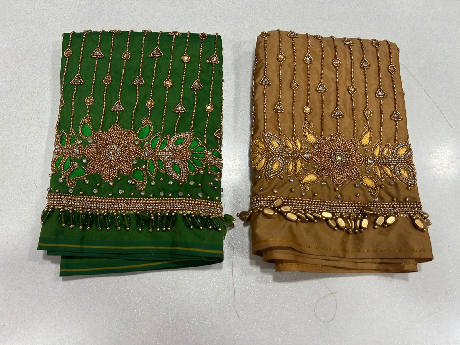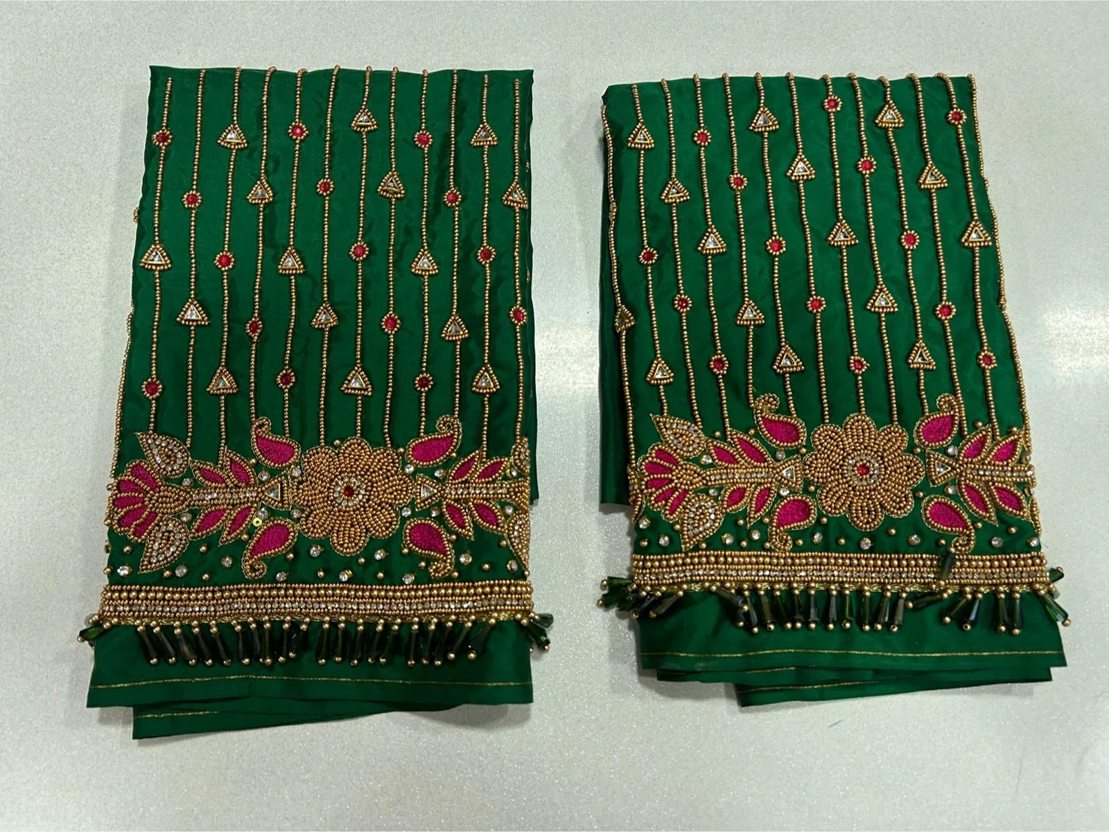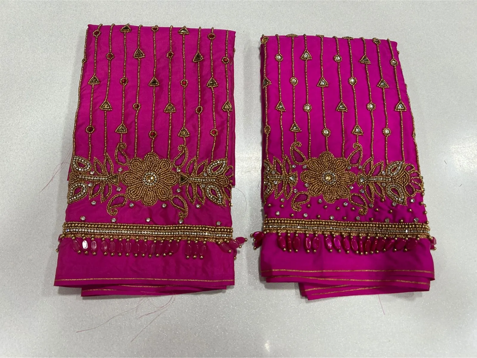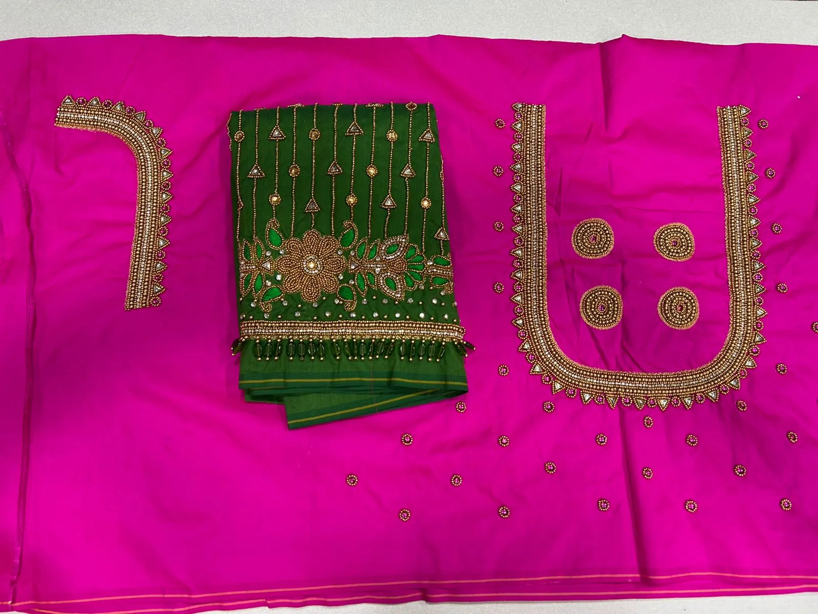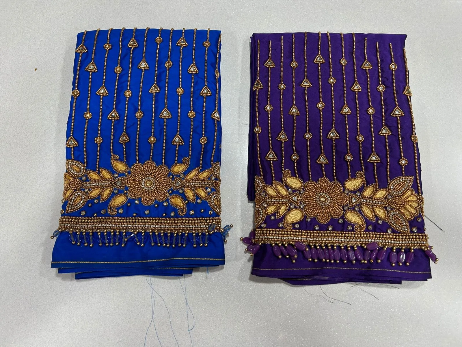 Stunning Blue Raw Silk with Aari Work blouse. Crafted for bridal wear, pairs beautifully with silk sarees and lehengas.