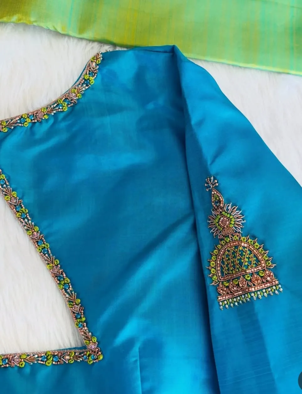Q: What material is used in the Blue Thread Maggam Work Blouse | Bridal & Party Wear Exclusive Design?