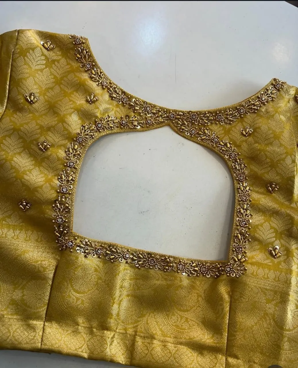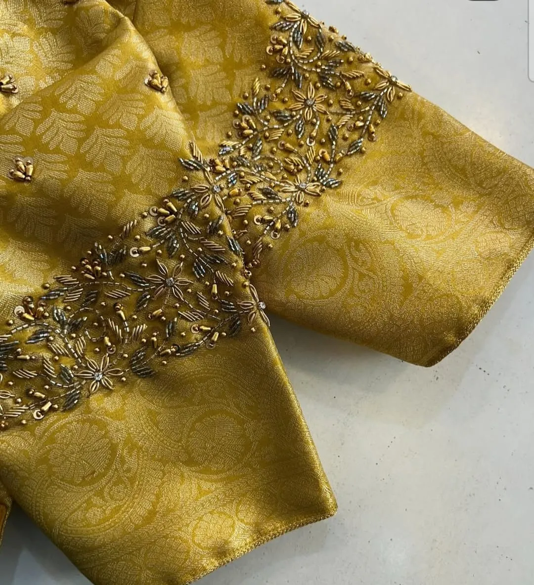 Stunning Gold Raw Silk with Maggam Work blouse. Crafted for bridal wear, pairs beautifully with silk sarees and lehengas.
