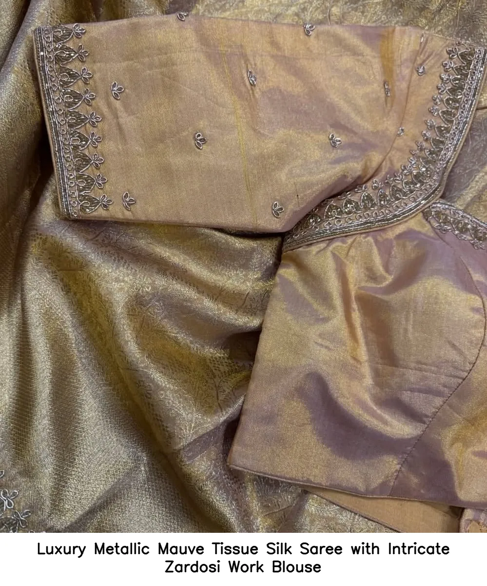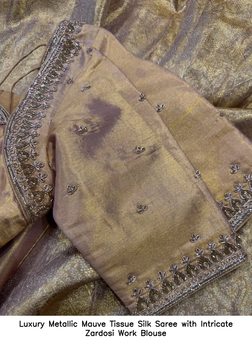 Luxury Metallic Mauve Tissue Silk Saree with Intricate Zardosi Work Blouse
