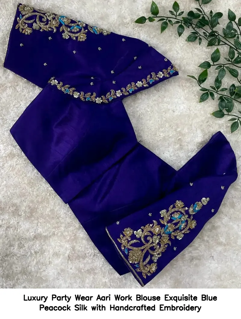 Luxury Party Wear Aari Work Blouse – Exquisite Blue Peacock Silk with Handcrafted Embroidery offers elegance and style for any occasion. This exquisite blouse enhances your outfit with its beautiful handcrafted embroidery. Moreover, it is designed to provide comfort while making a fashion statement.