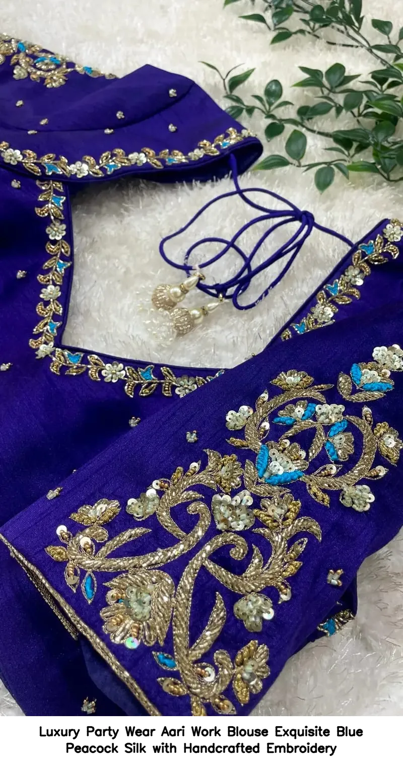This Luxury Party Wear Aari Work Blouse is made from exquisite blue peacock silk. It is available in sizes XL, XXL, and 3XL. For more options, browse our collection and explore various colors.
