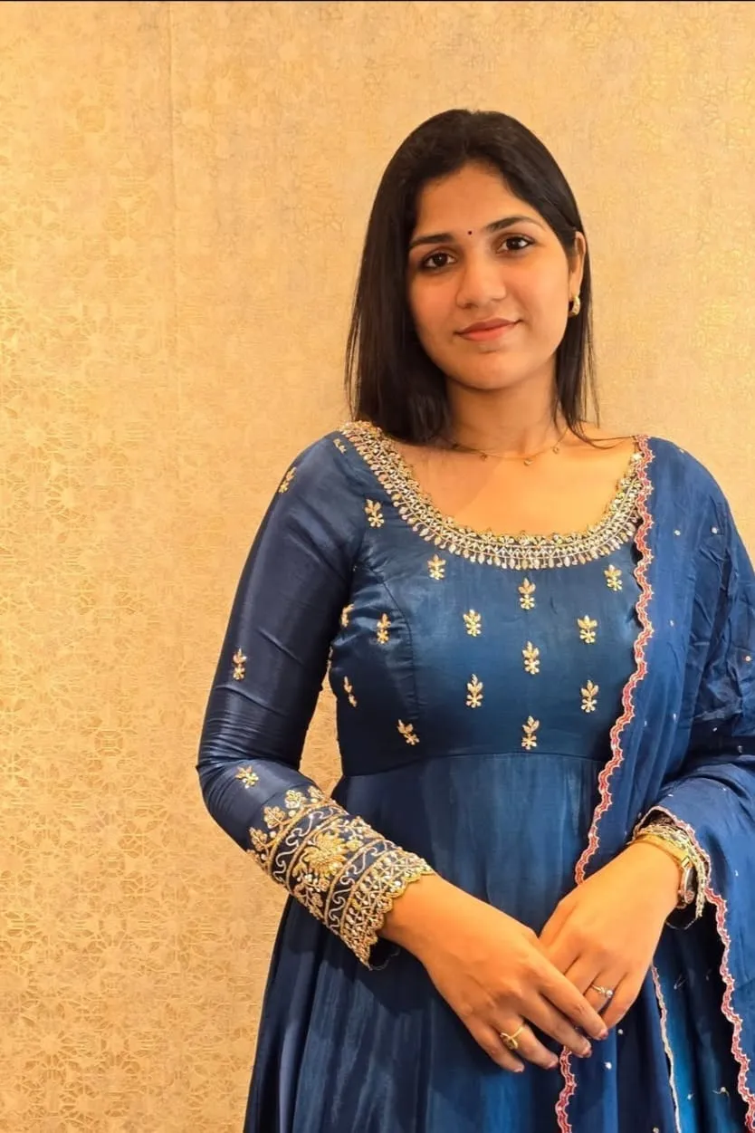 Q: How do I choose the right size for the Peacock Blue Wedding Maggam Work Long Frock with Dupatta Custom Sizes Best Price Offer?