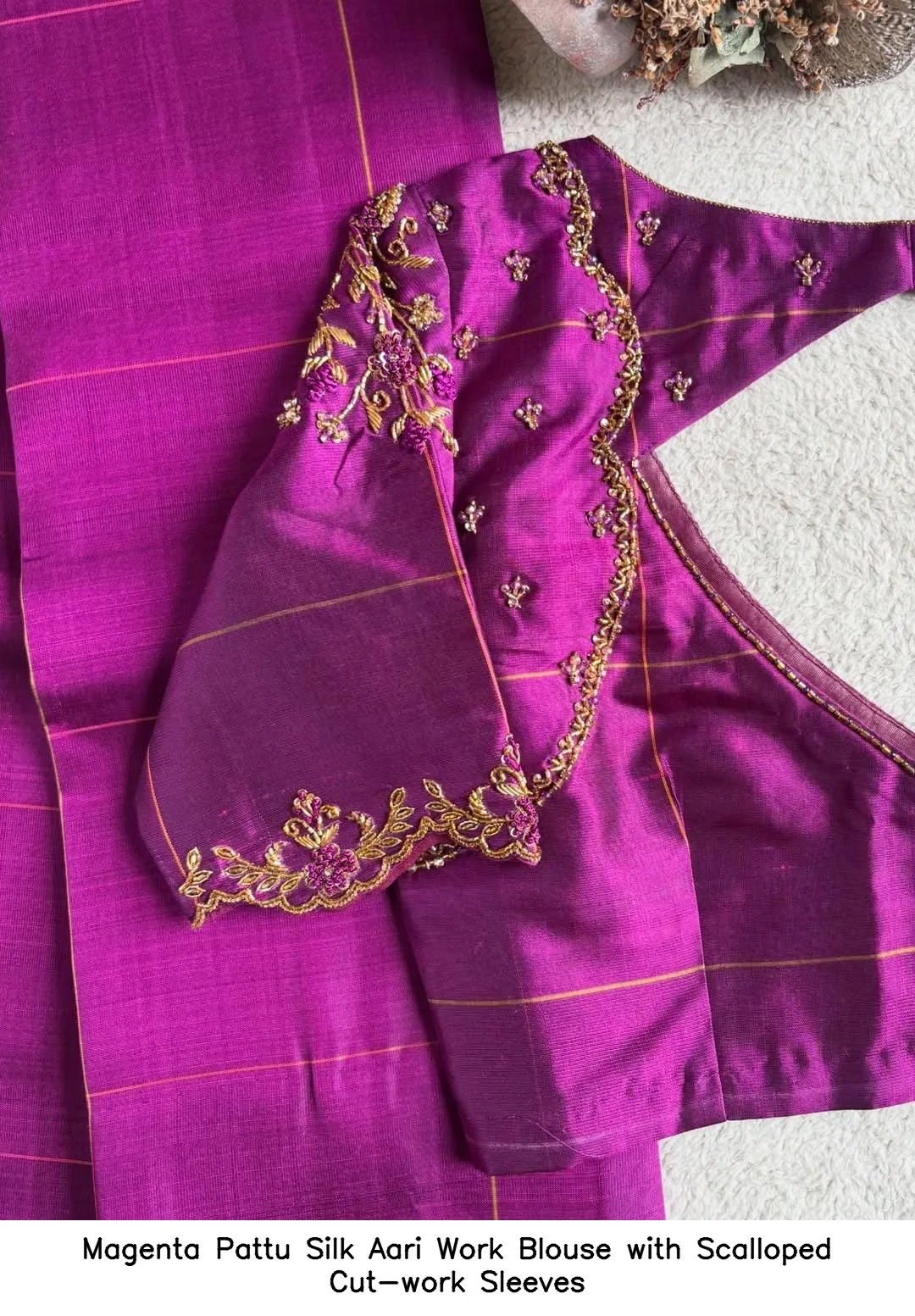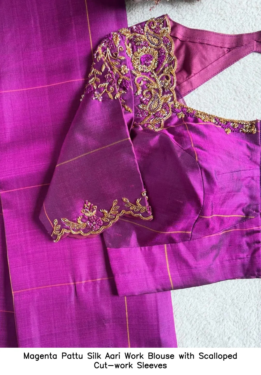 Magenta Pattu Silk Aari Work Blouse with Scalloped Cut-work Sleeves