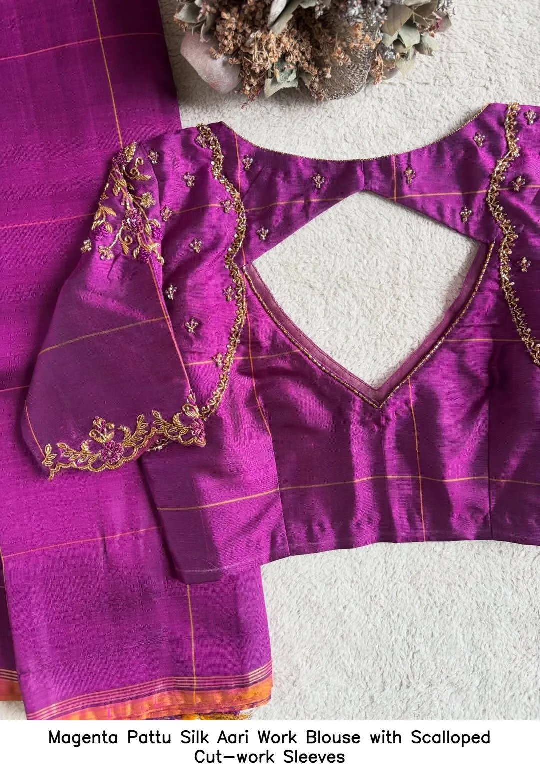 Explore more stunning blouses like the Magenta Pattu Silk Aari Work Blouse with Scalloped Cut-work Sleeves. Browse our collection today to find the perfect piece for your next event! Don’t forget to follow us on Facebook for the latest updates and offers.