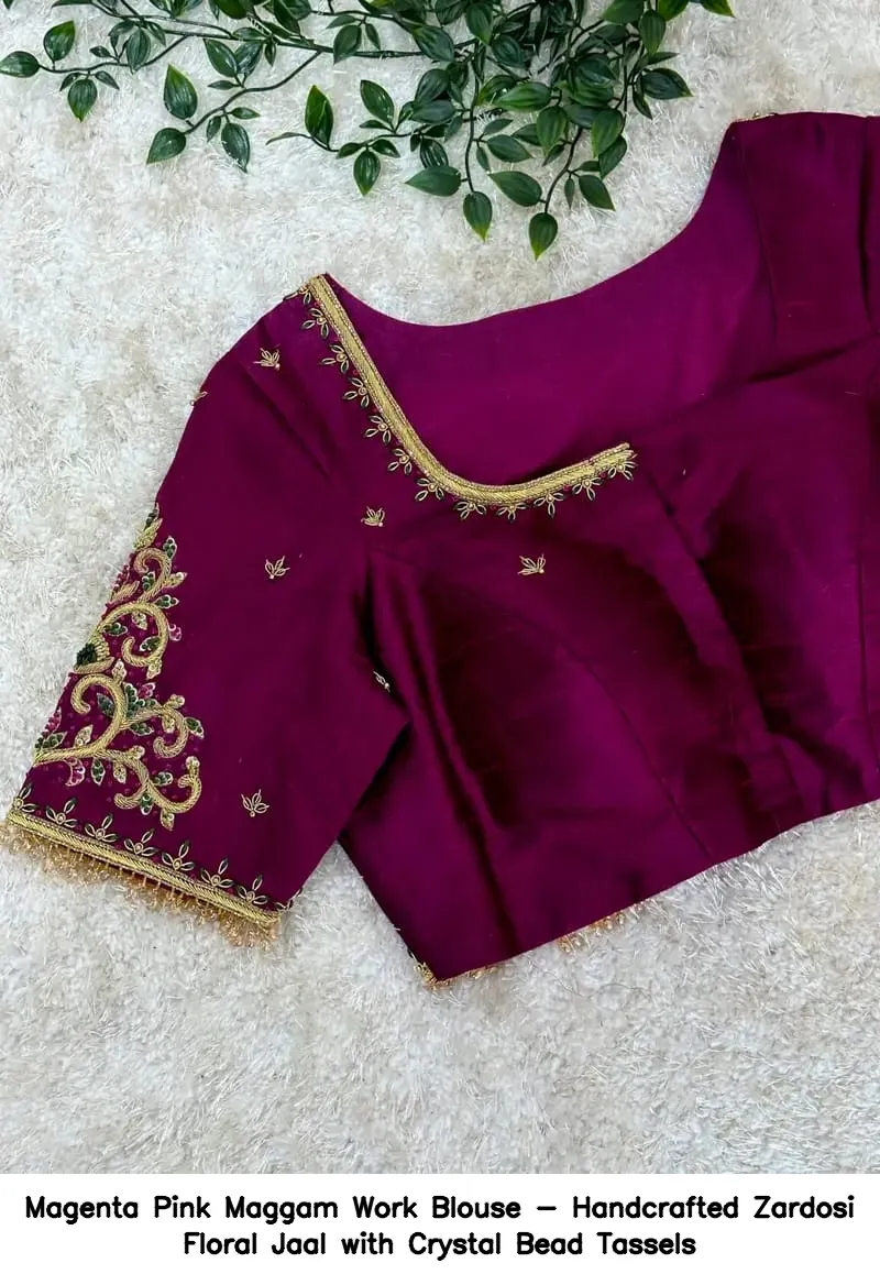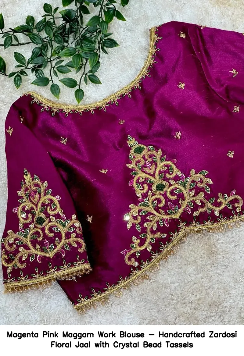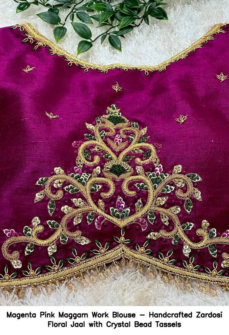 Magenta Pink Maggam Work Blouse – Handcrafted Zardosi Floral Jaal with Crystal Bead Tassels