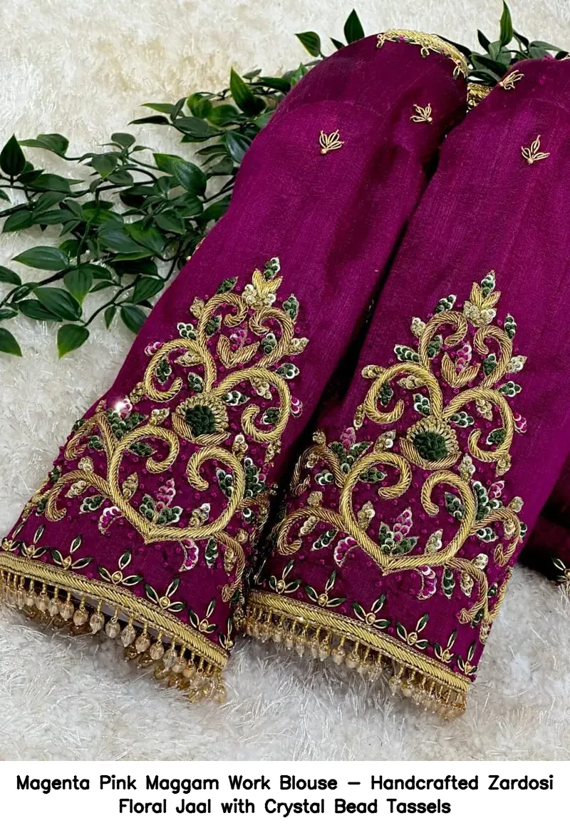 Introducing the exquisite Magenta Pink Maggam Work Blouse – Handcrafted Zardosi Floral Jaal with Crystal Bead Tassels. This stunning blouse is perfect for any festive occasion, combining traditional craftsmanship with contemporary elegance.
