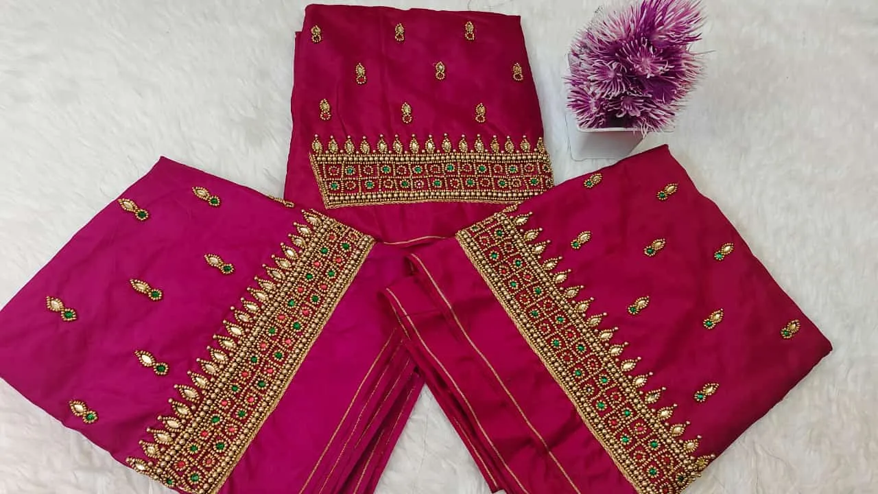 Stunning Purple Raw Silk with Aari Work blouse. Crafted for wedding and festive wear, pairs beautifully with silk sarees and lehengas.