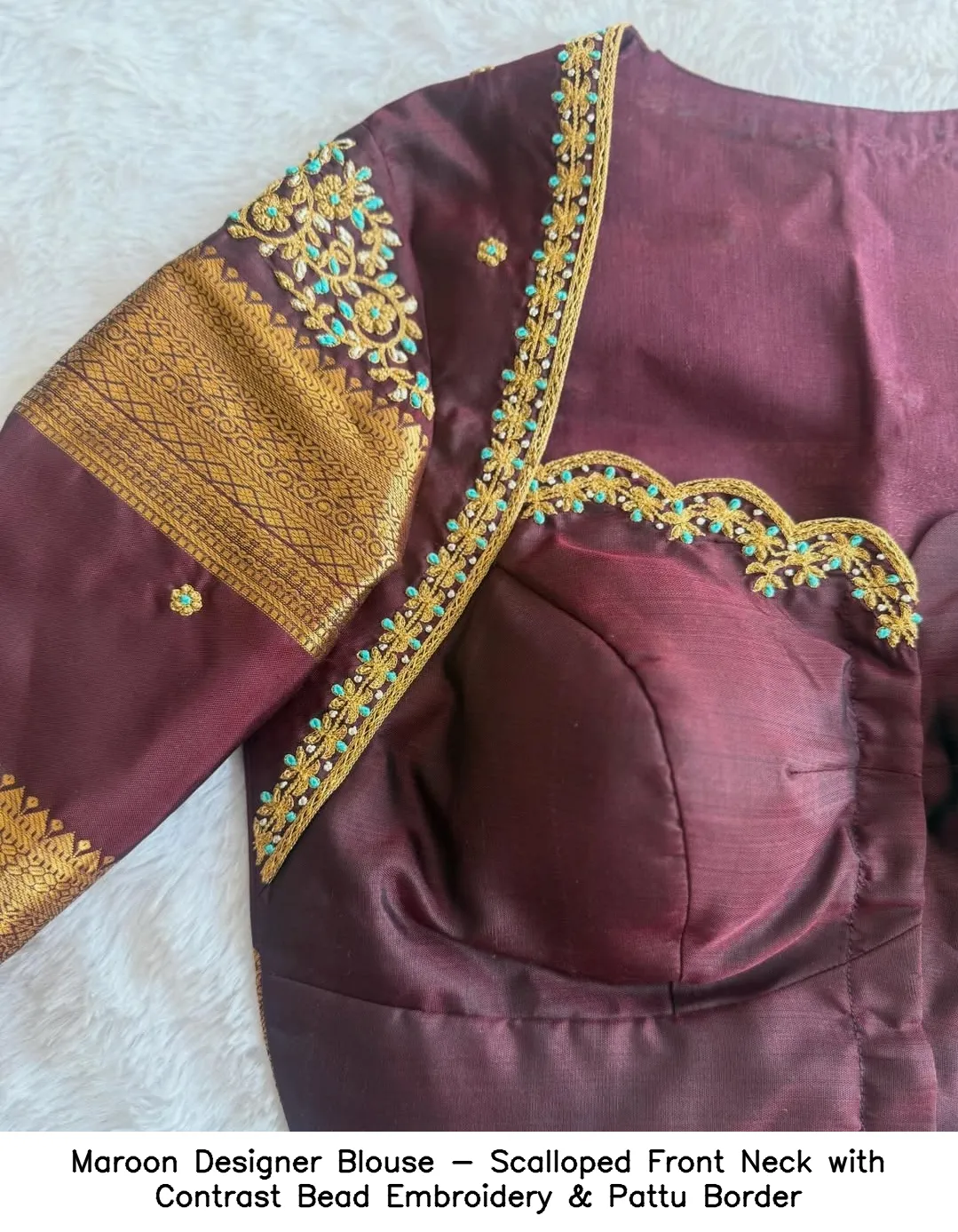 Maroon Designer Blouse – Scalloped Front Neck with Contrast Bead Embroidery & Pattu Border