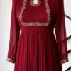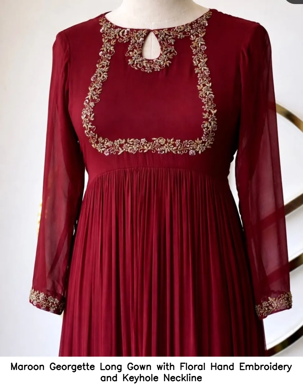 Maroon Georgette Long Gown with Floral Hand Embroidery and Keyhole Neckline
