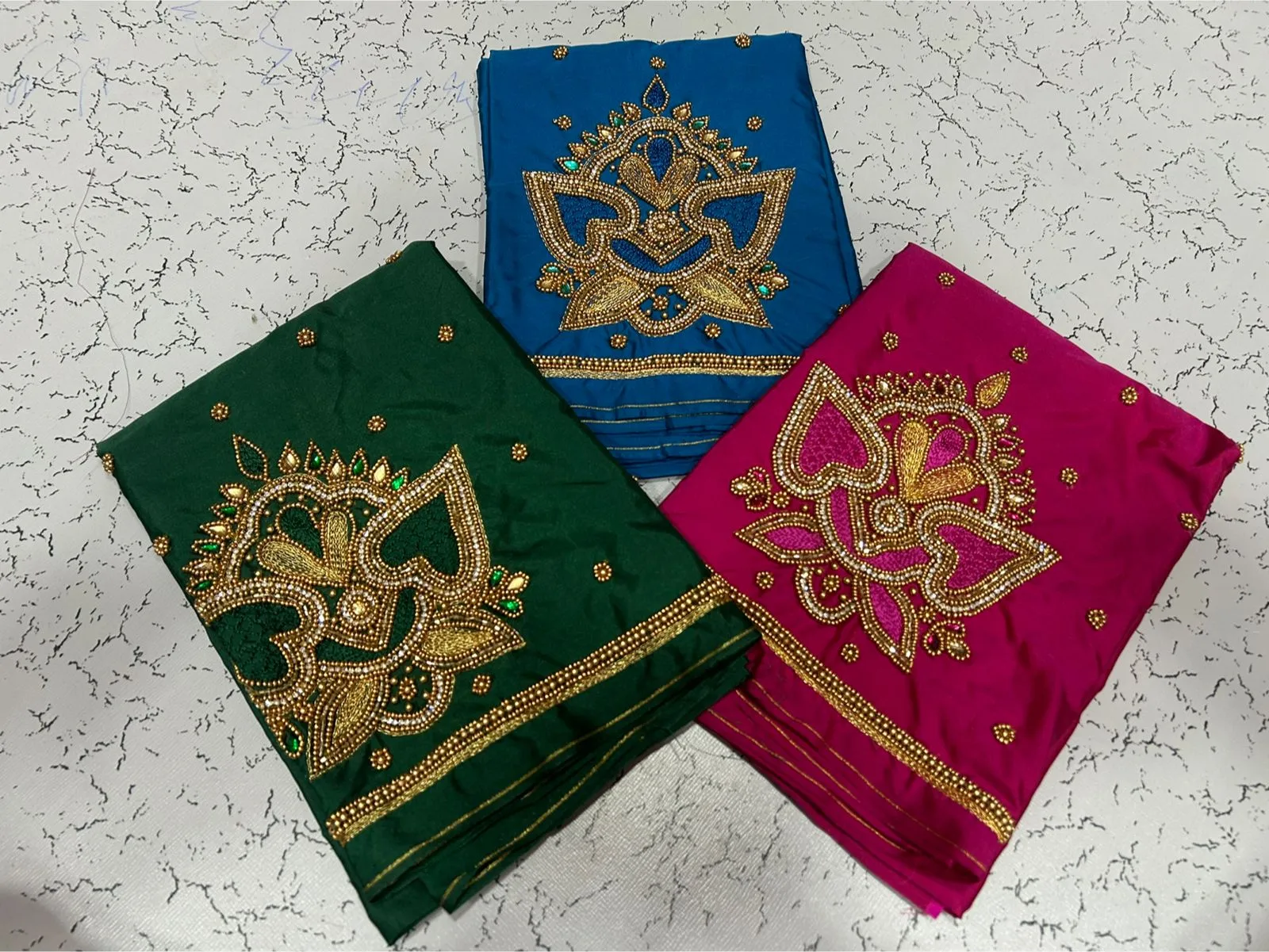 This Maroon Premium Aari Work Blouse is made from half pattu fabric. It is available in sizes XL, XXL, and 3XL. Additionally, you can choose from a vibrant color palette including Red, Pink, Blue, Purple, and Wine. To explore more options, browse our collection.