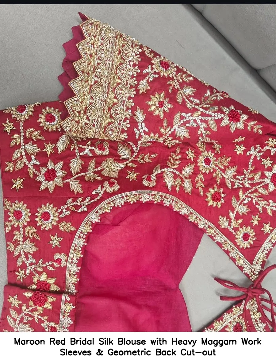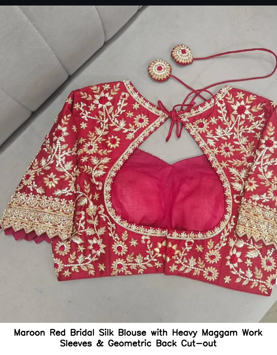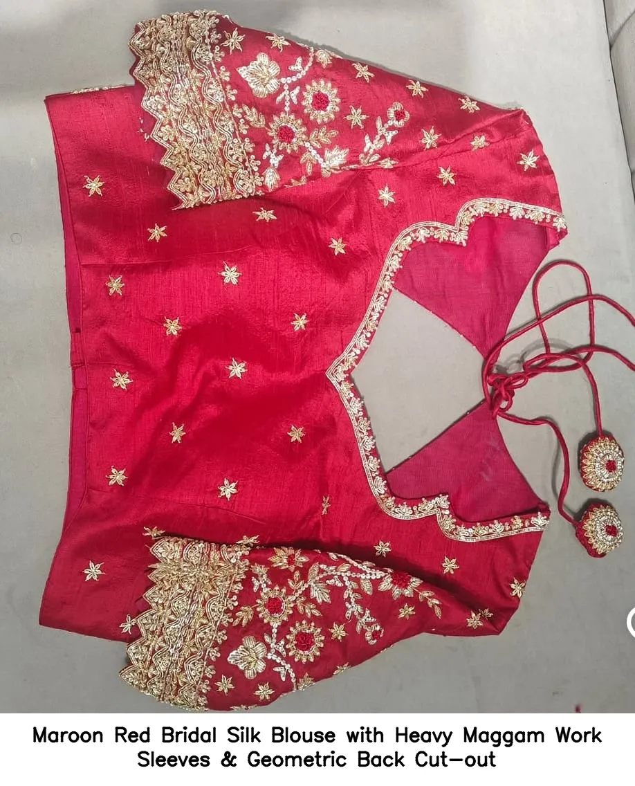 Explore more stunning designs like the Maroon Red Bridal Silk Blouse with Heavy Maggam Work Sleeves & Geometric Back Cut-out by browsing our collection. You’ll find a variety of exquisite blouses perfect for any occasion. Don’t forget to follow us on Facebook for updates on our latest designs!
