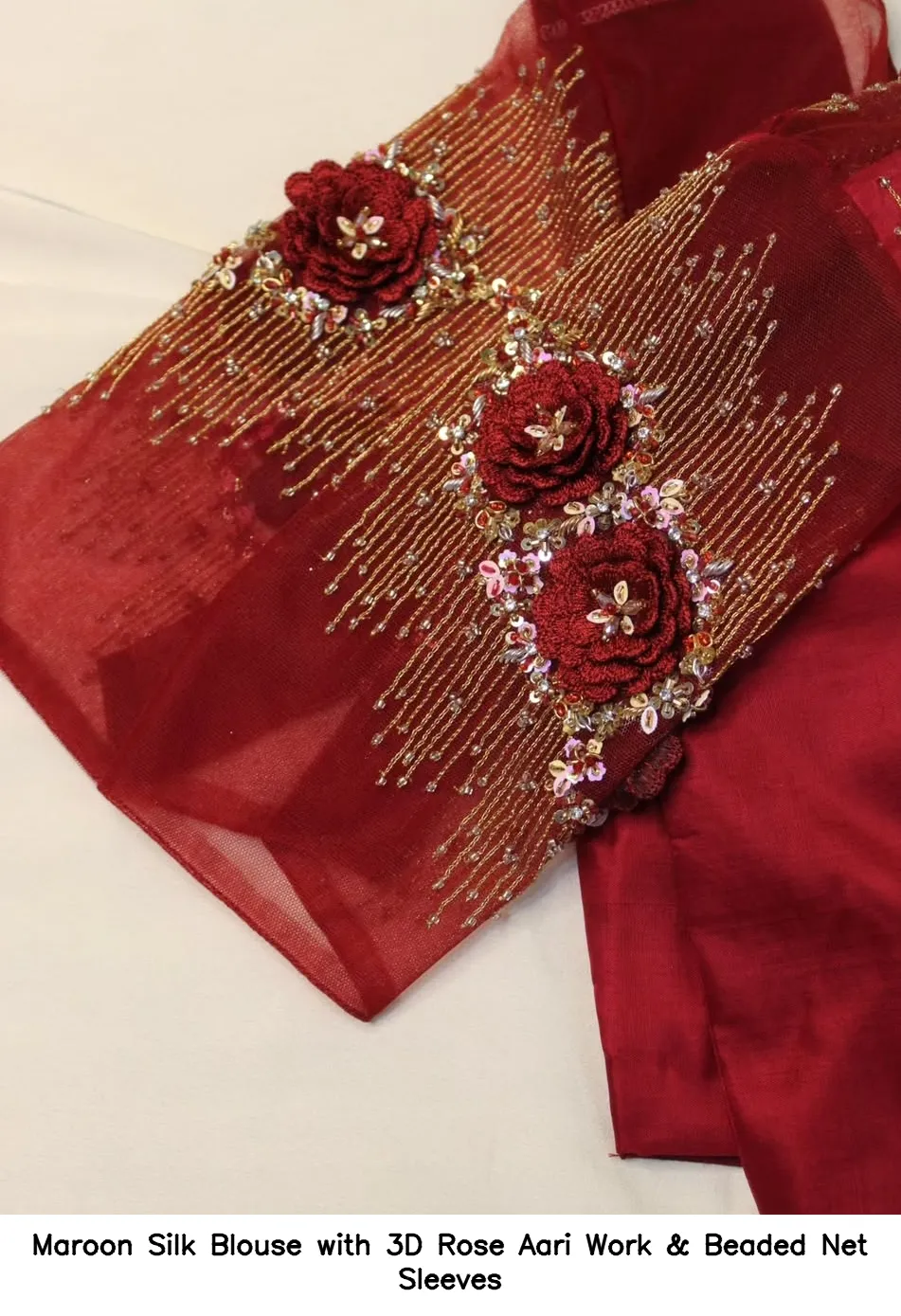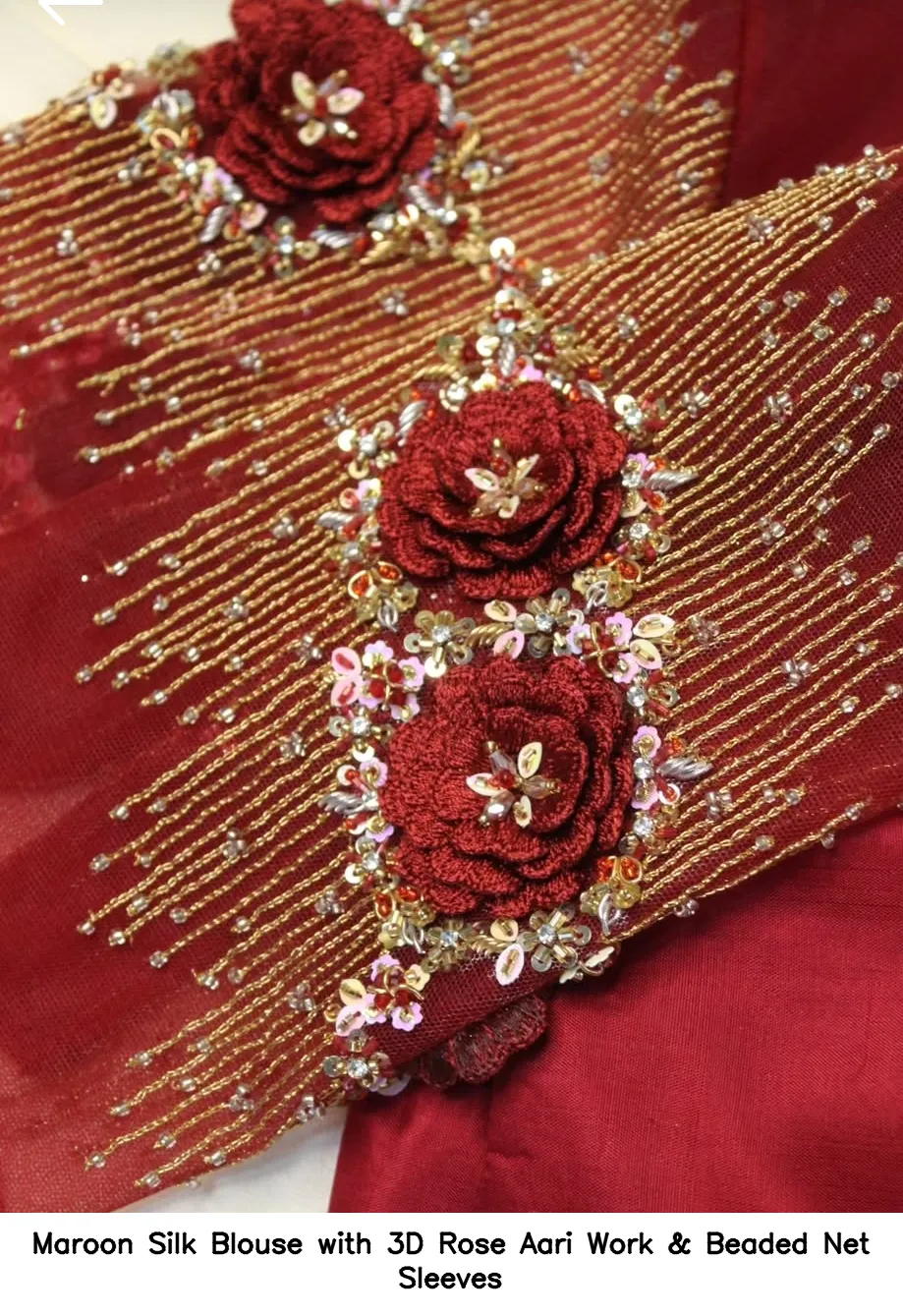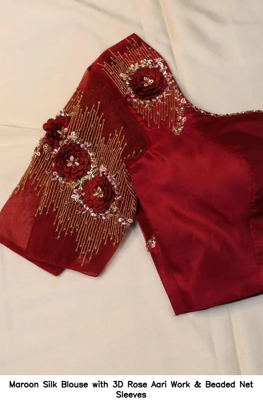 Maroon Silk Blouse with 3D Rose Aari Work & Beaded Net Sleeves