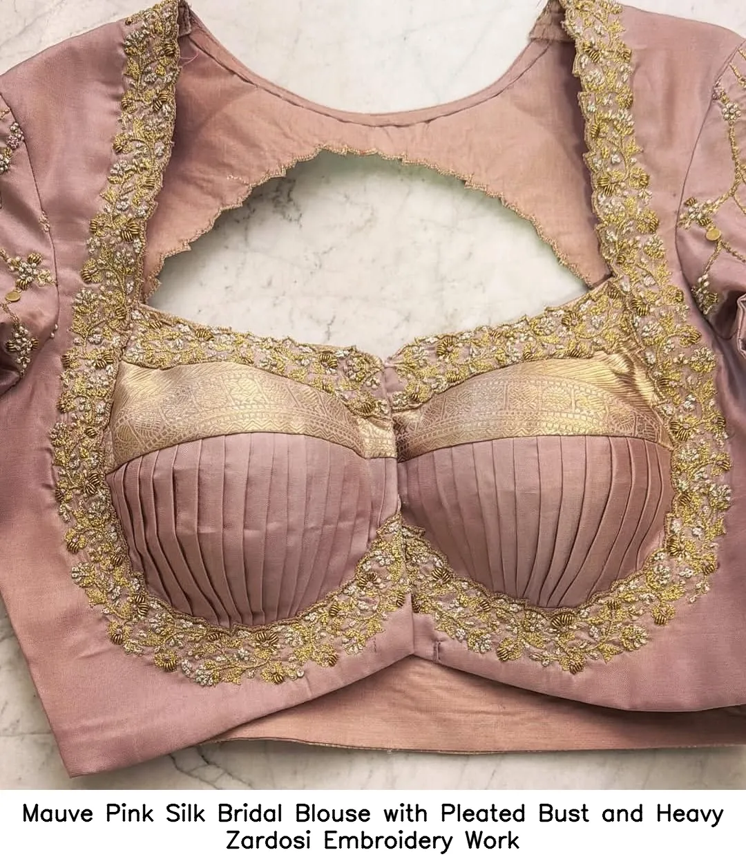 Product Name: Mauve Pink Silk Bridal Blouse with Pleated Bust and Heavy Zardosi Embroidery Work