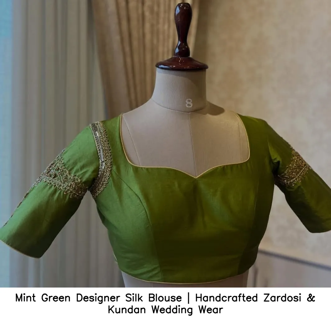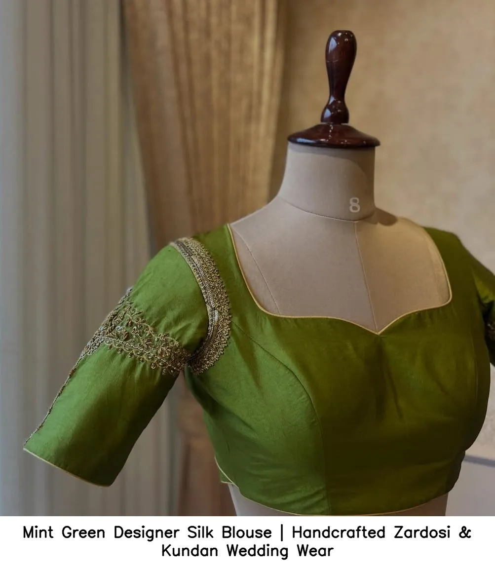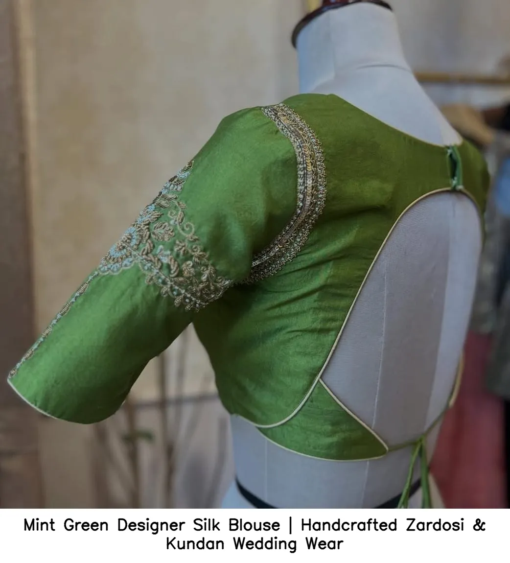 Why Choose Mint Green Designer Silk Blouse | Handcrafted Zardosi & Kundan Wedding Wear?