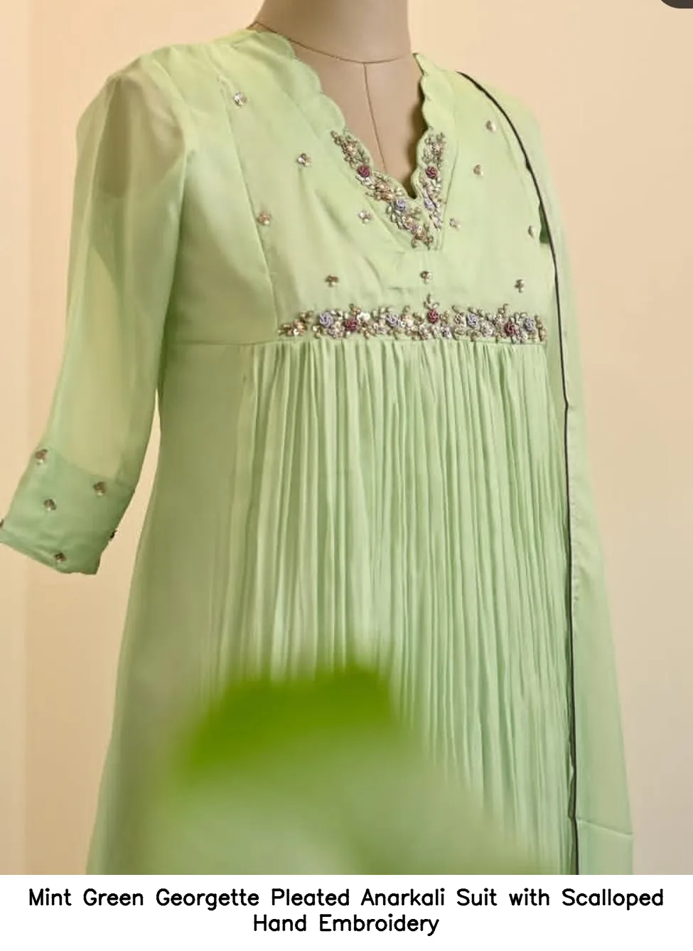Mint Green Georgette Pleated Anarkali Suit with Scalloped Hand Embroidery