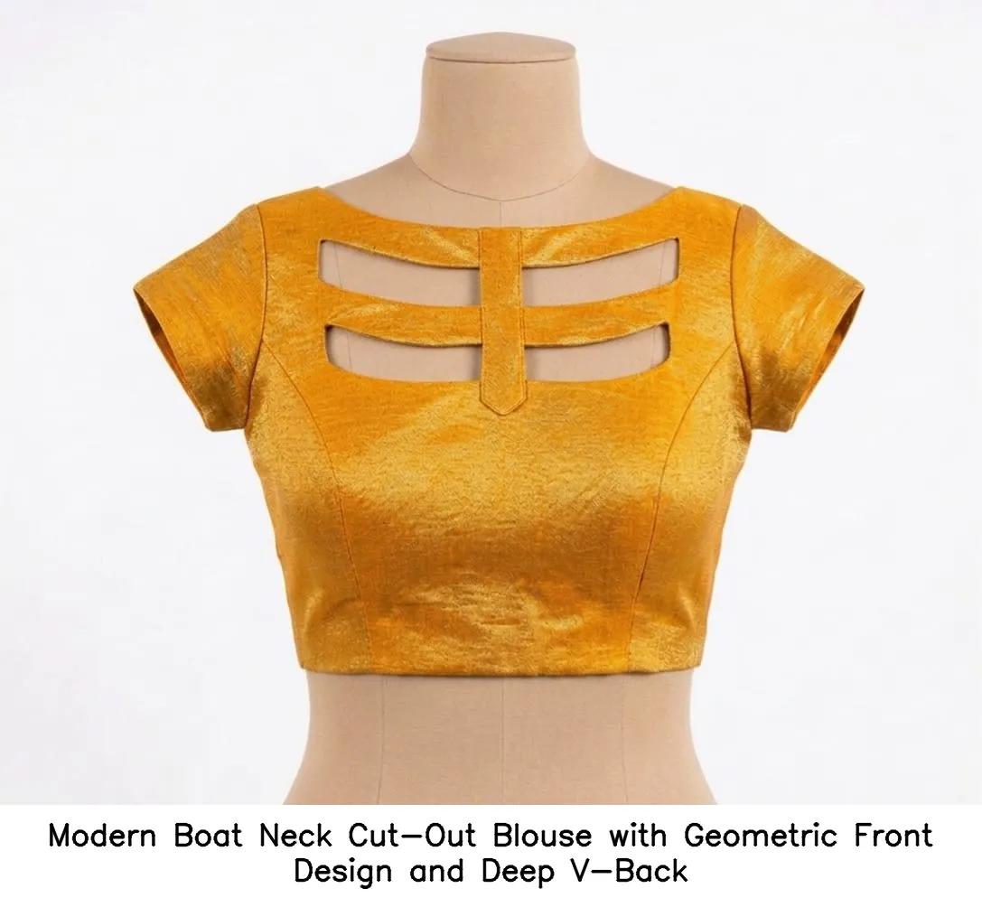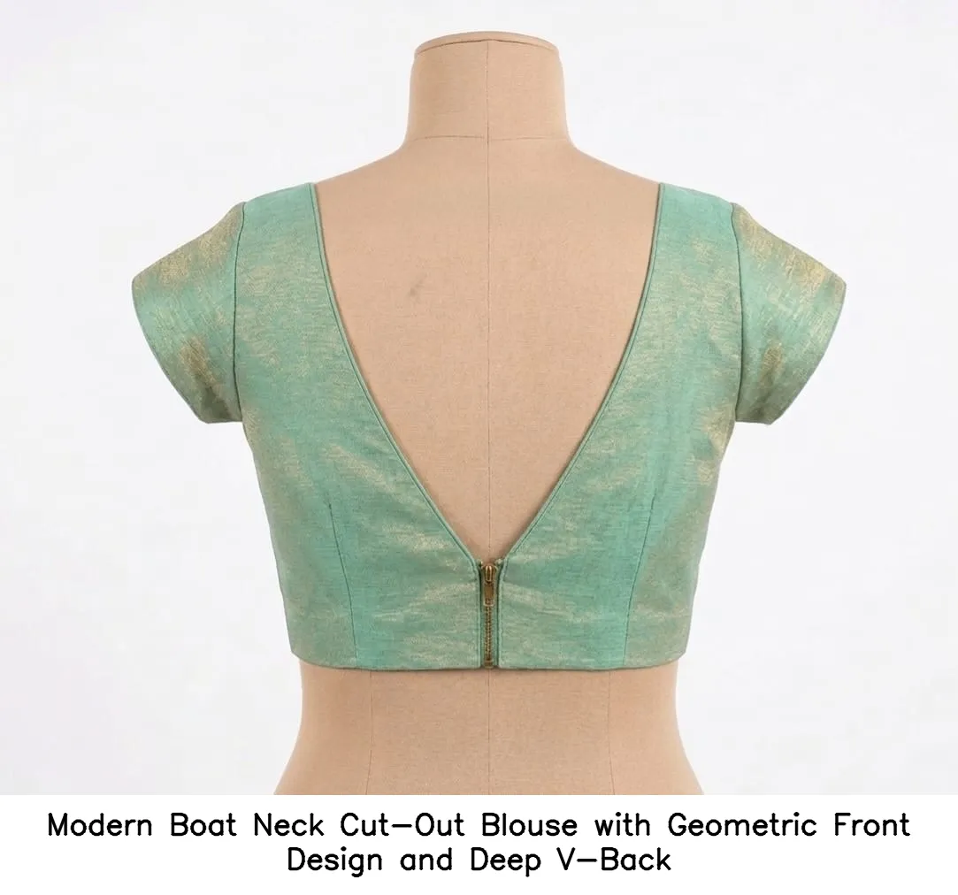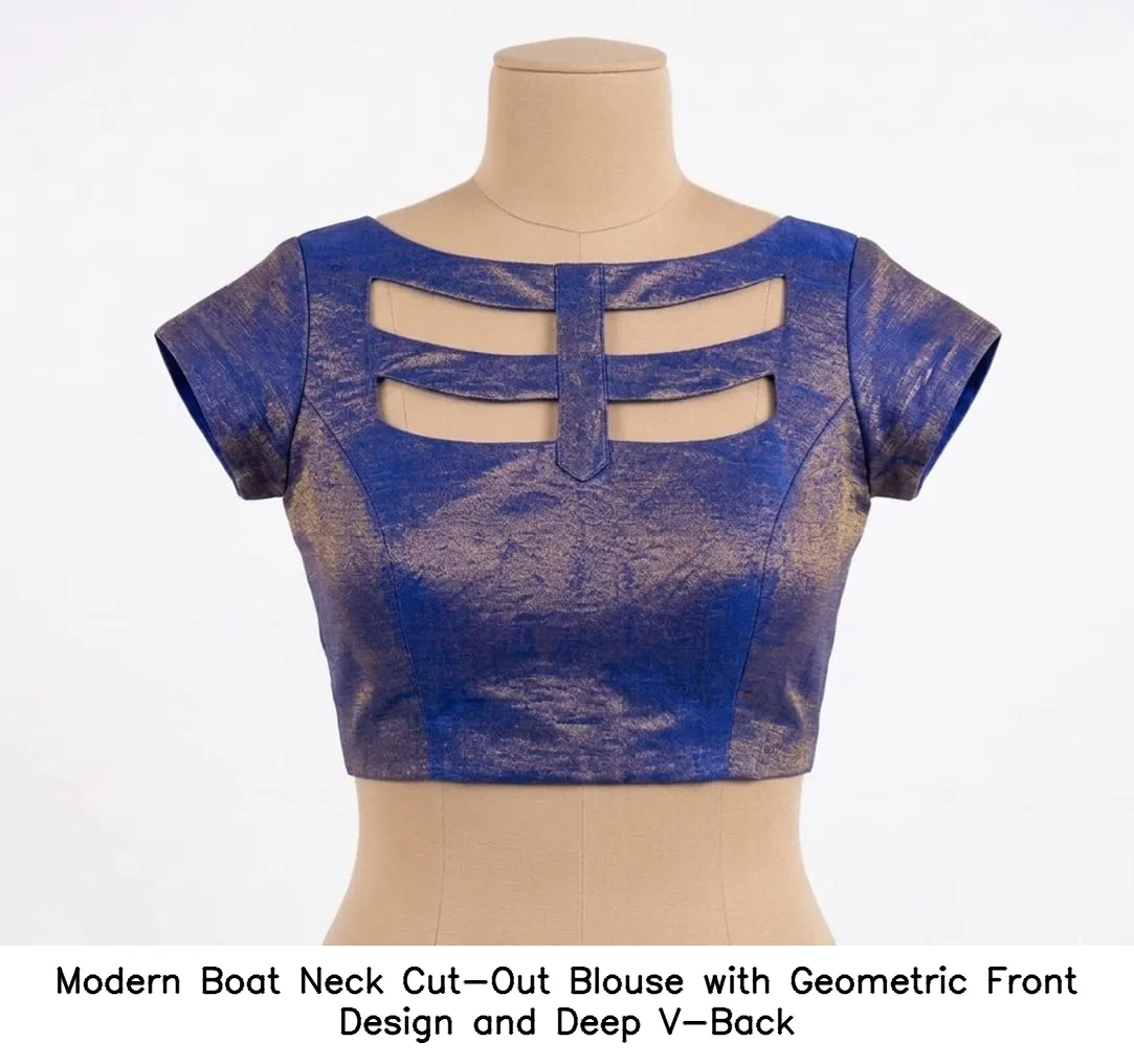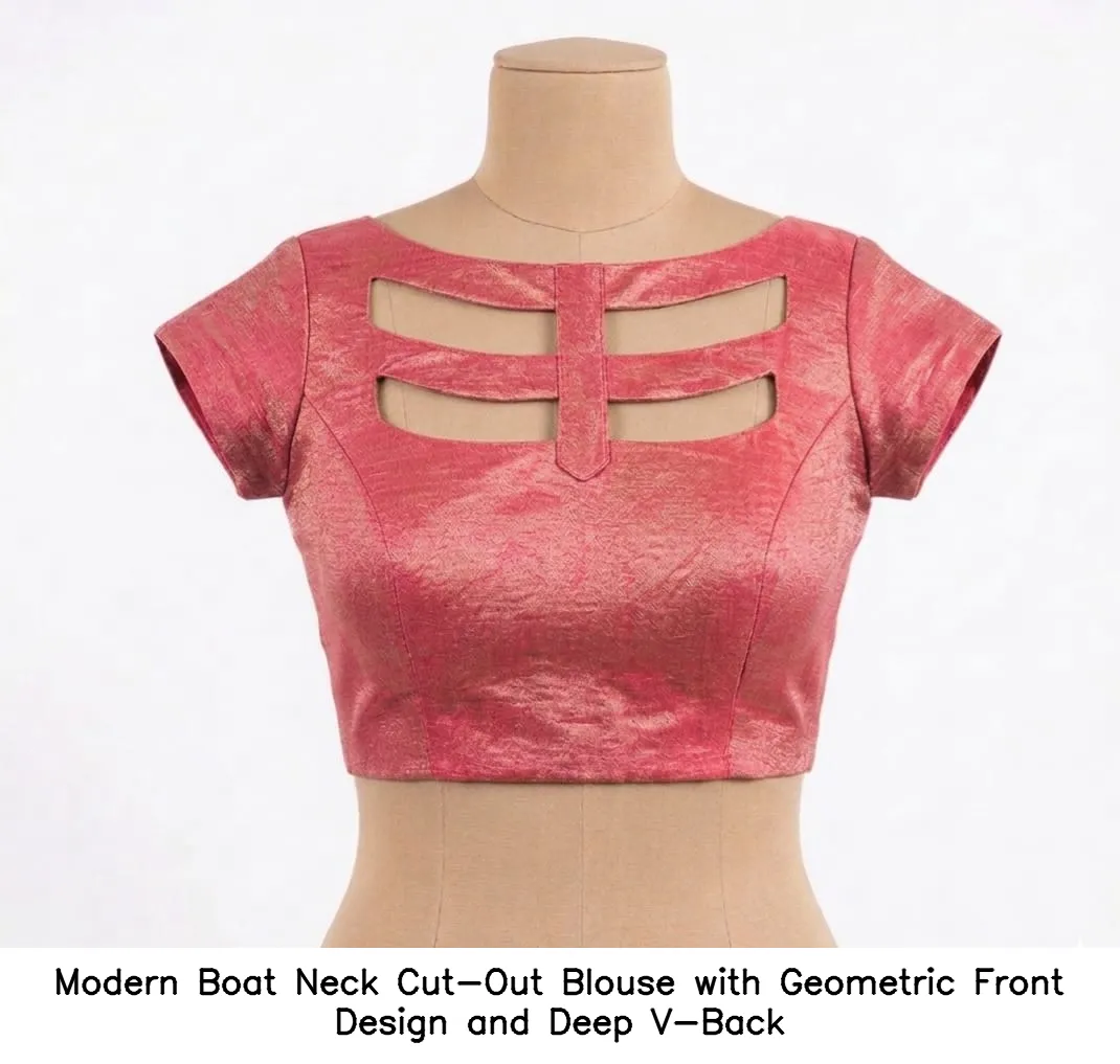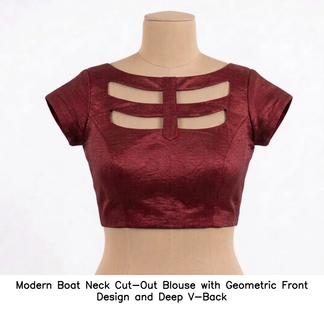 Product Name: ​​Modern Boat Neck Cut-Out Blouse with Geometric Front Design and Deep V-Back