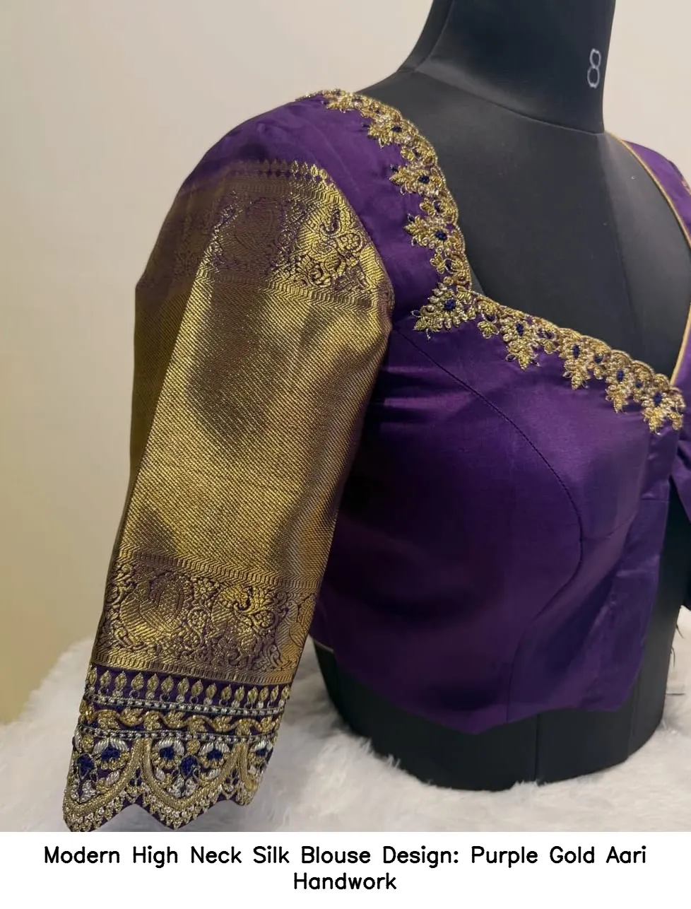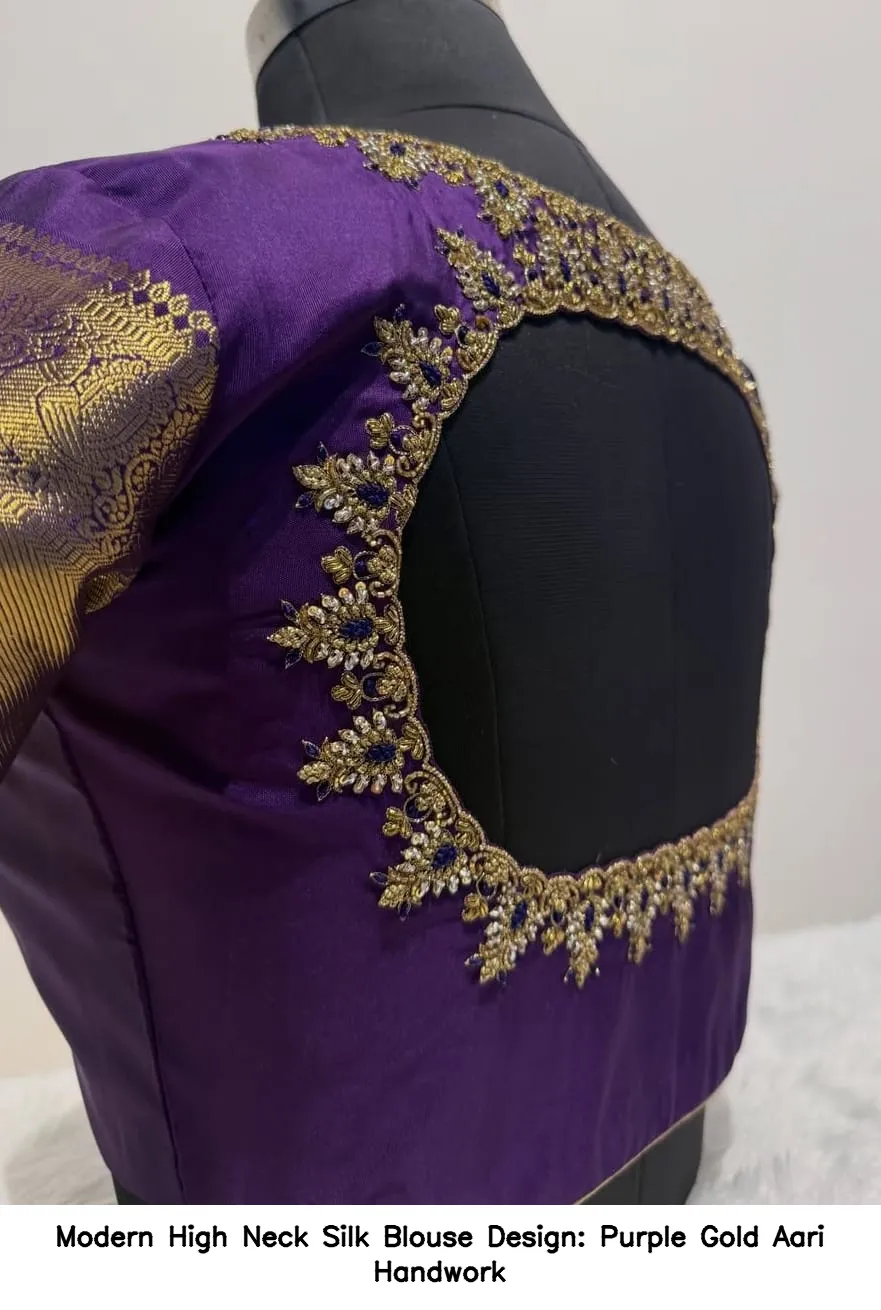 Modern High Neck Silk Blouse Design: Purple Gold Aari Handwork Features and Benefits