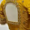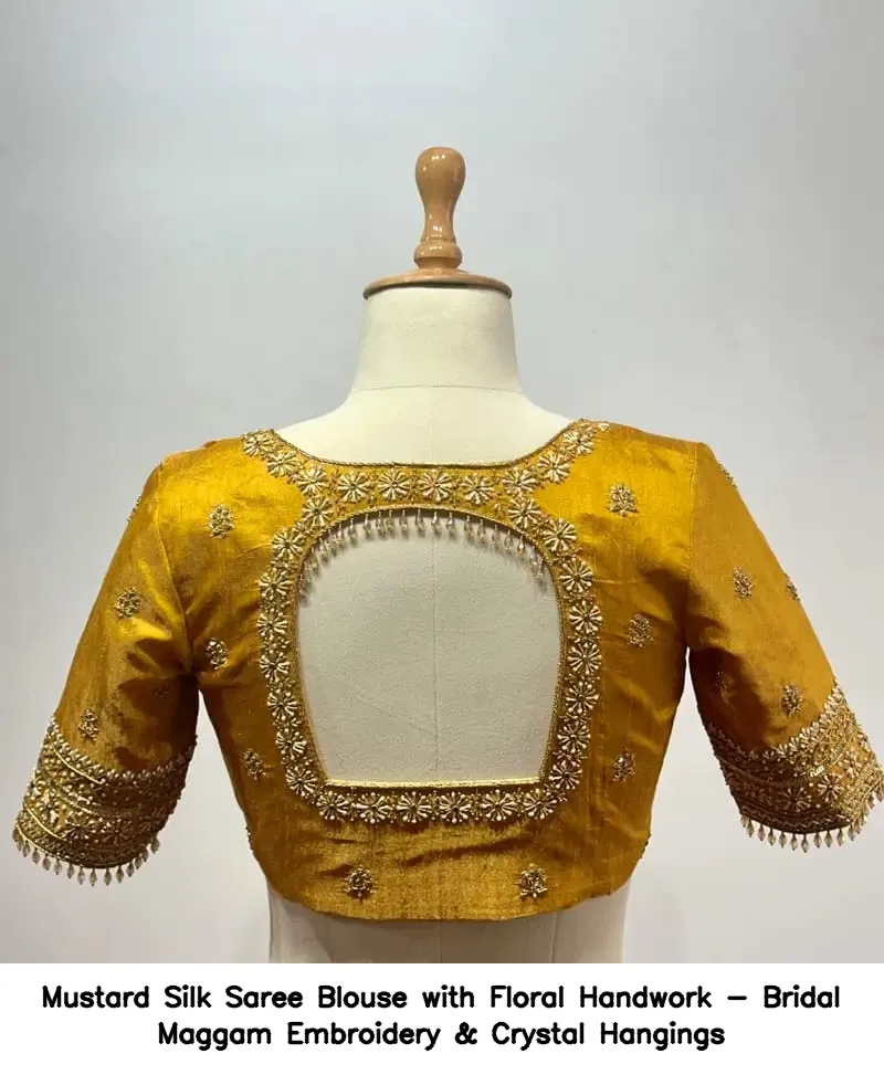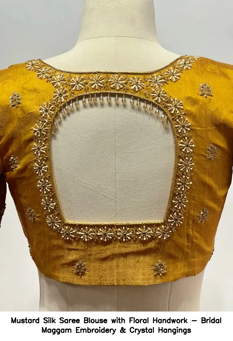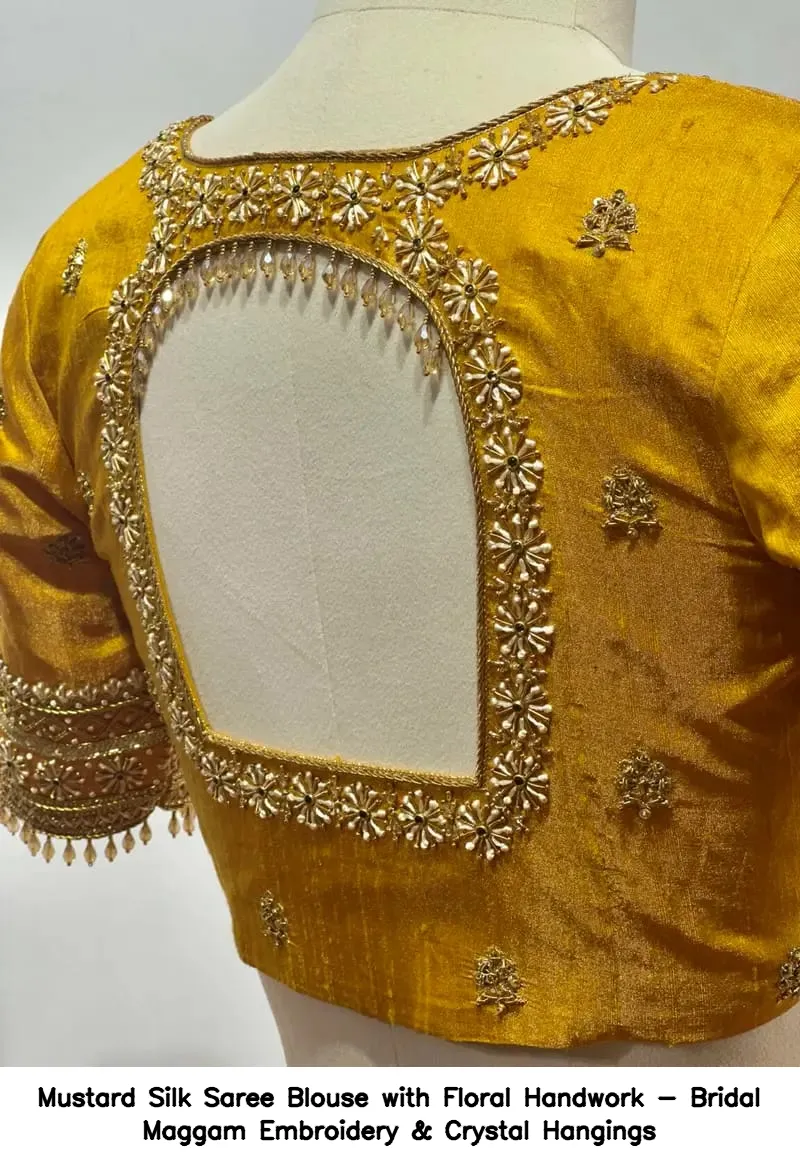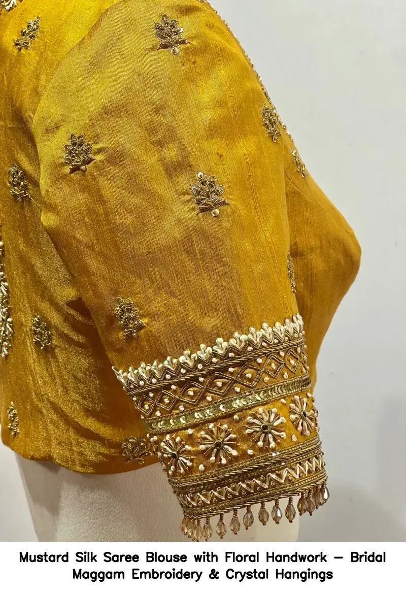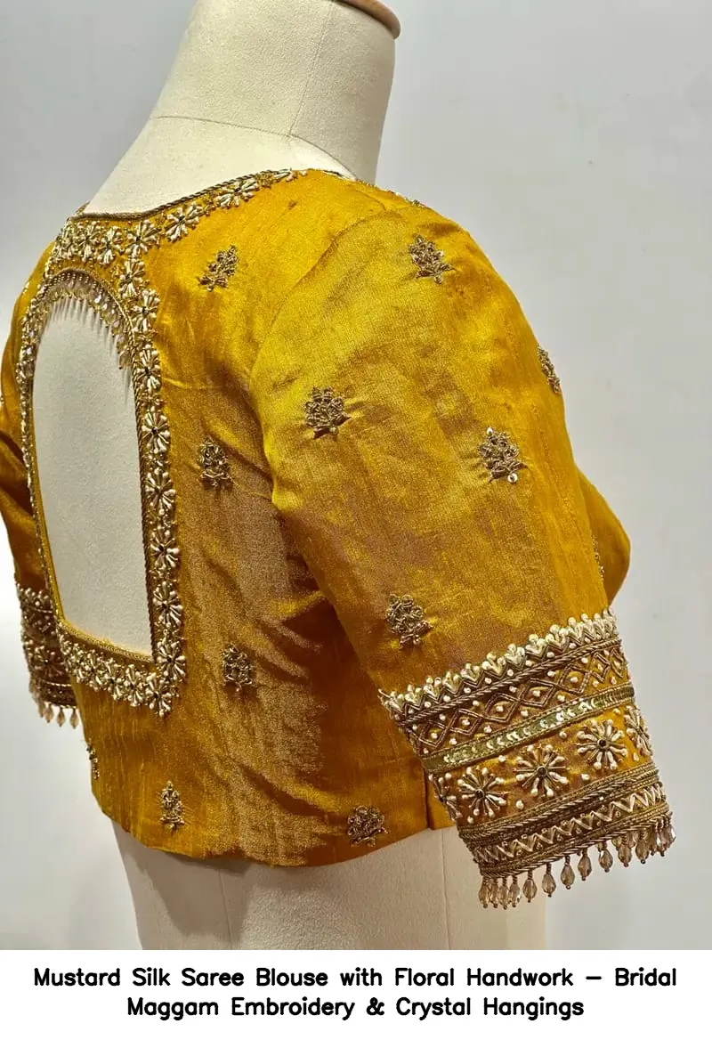 Mustard Silk Saree Blouse with Floral Handwork – Bridal Maggam Embroidery & Crystal Hangings