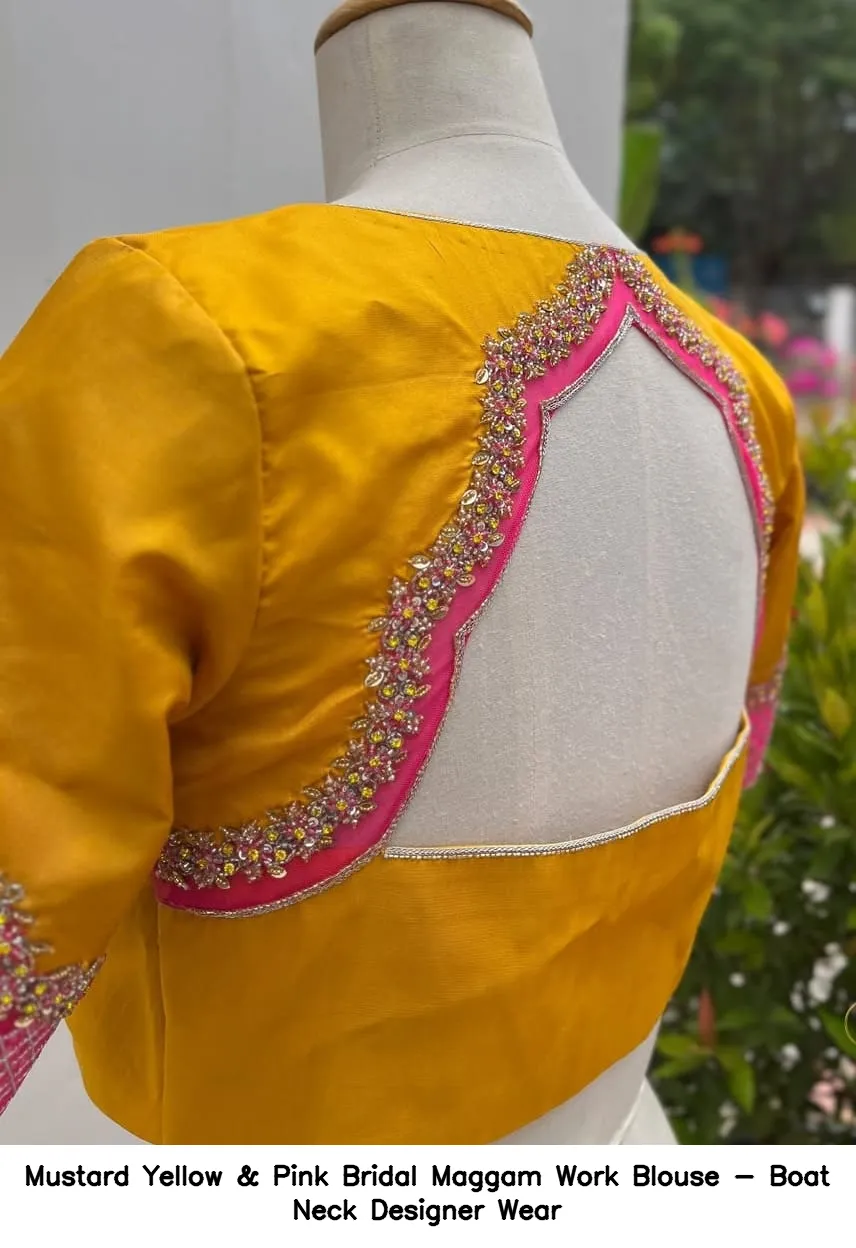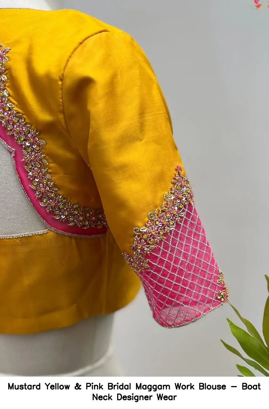 Mustard Yellow & Pink Bridal Maggam Work Blouse – Boat Neck Designer Wear