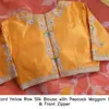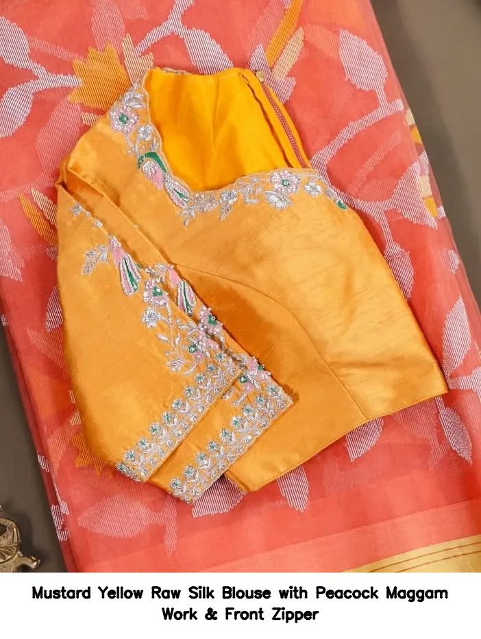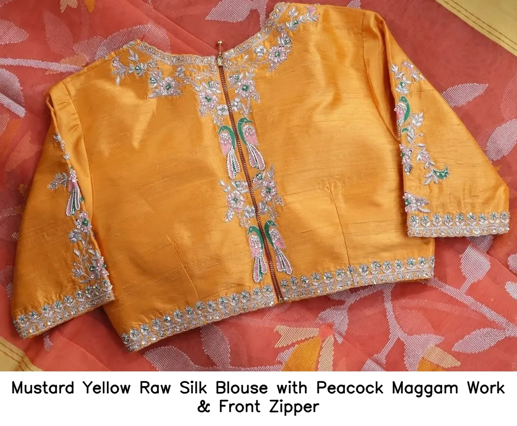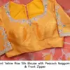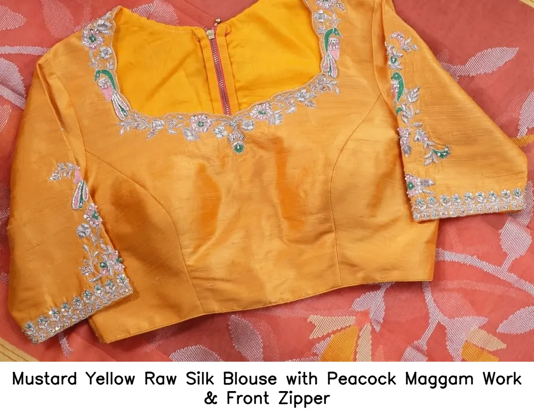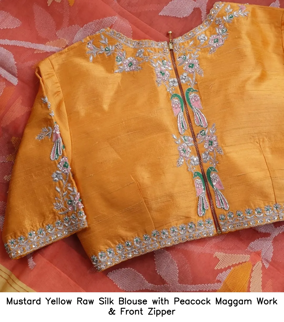 Mustard Yellow Raw Silk Blouse with Peacock Maggam Work & Front Zipper