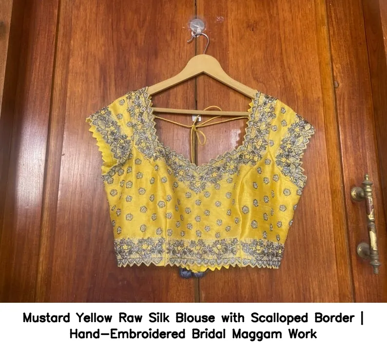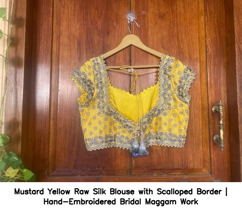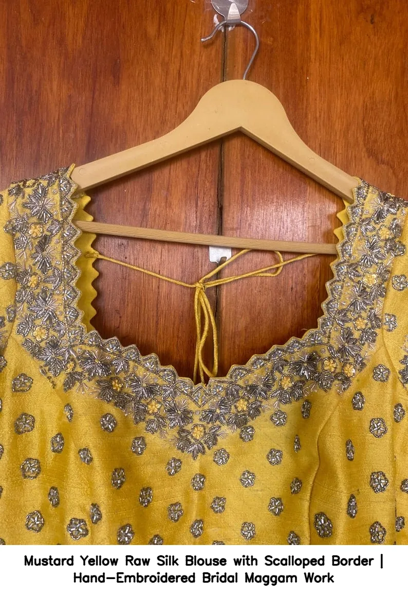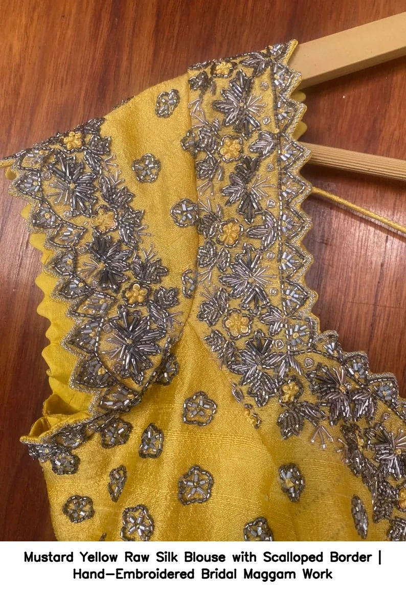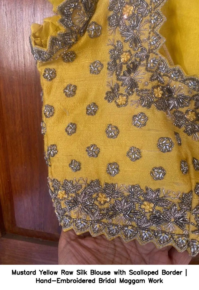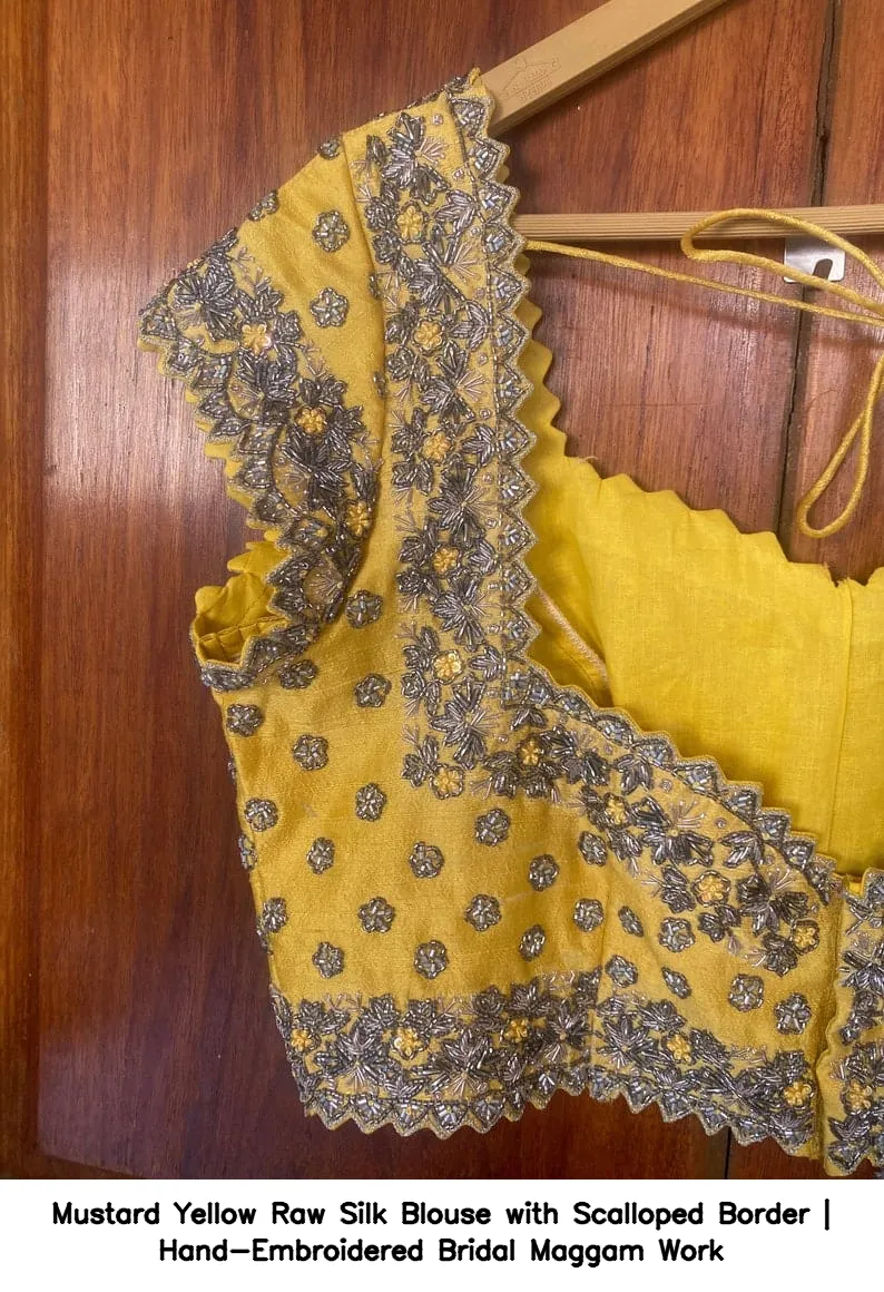Why Choose Mustard Yellow Raw Silk Blouse with Scalloped Border | Hand-Embroidered Bridal Maggam Work?