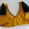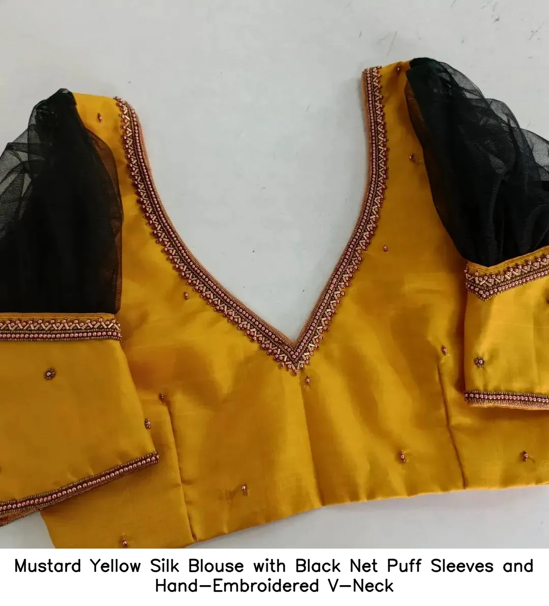 Why Choose the Mustard Yellow Silk Blouse with Black Net Puff Sleeves and Hand-Embroidered V-Neck?